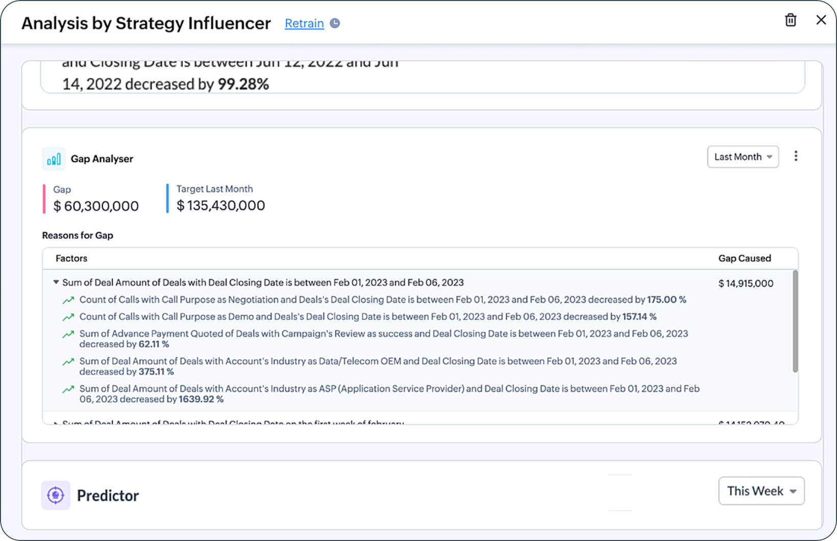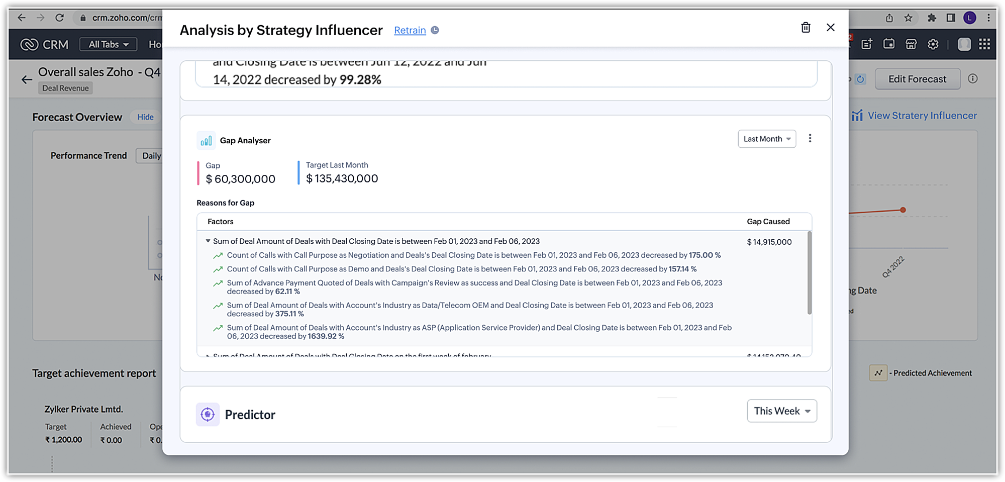 Zia identifies the top-contributing picklist and lookup field values and displays their predicted and achieved targets, along with their impact during different time periods, using the Predictor component. Additionally, you have the option to select specific contributing factors that are relevant to your needs.