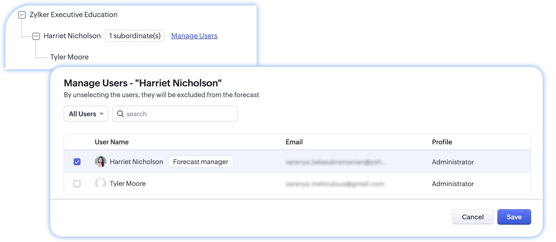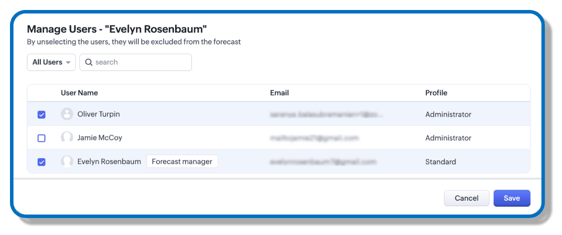 By default, it includes all active users to participate in sales forecasting. However, in reality, not all users might take part in sales or forecasting, and you can customize this hierarchy from within the forecast in Zoho CRM.