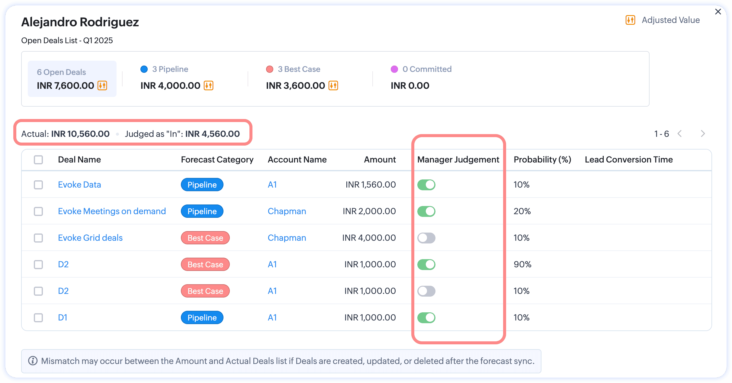 A manager by hierarchy is a seasoned executive who will know the market and the subordinates' skillsets. So, using this knowledge, intuition, and confidence, the managers can include deals that would close in this forecast period. Once the judgment is evaluated for each user, the table will display a total value based on judgment for reference.