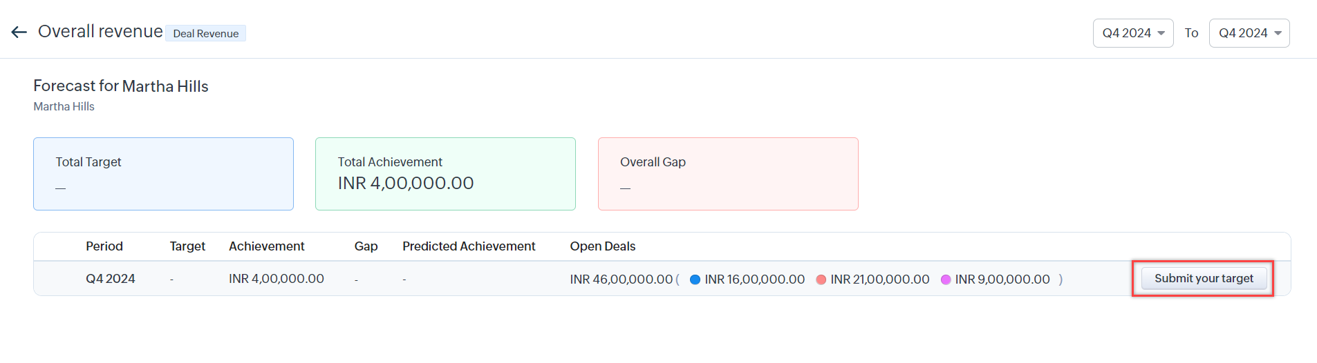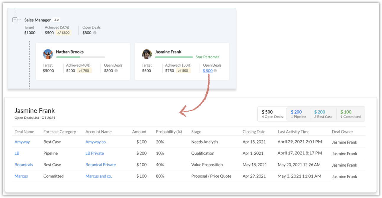 - In the target achievement report of the desired user, click on their open deals.