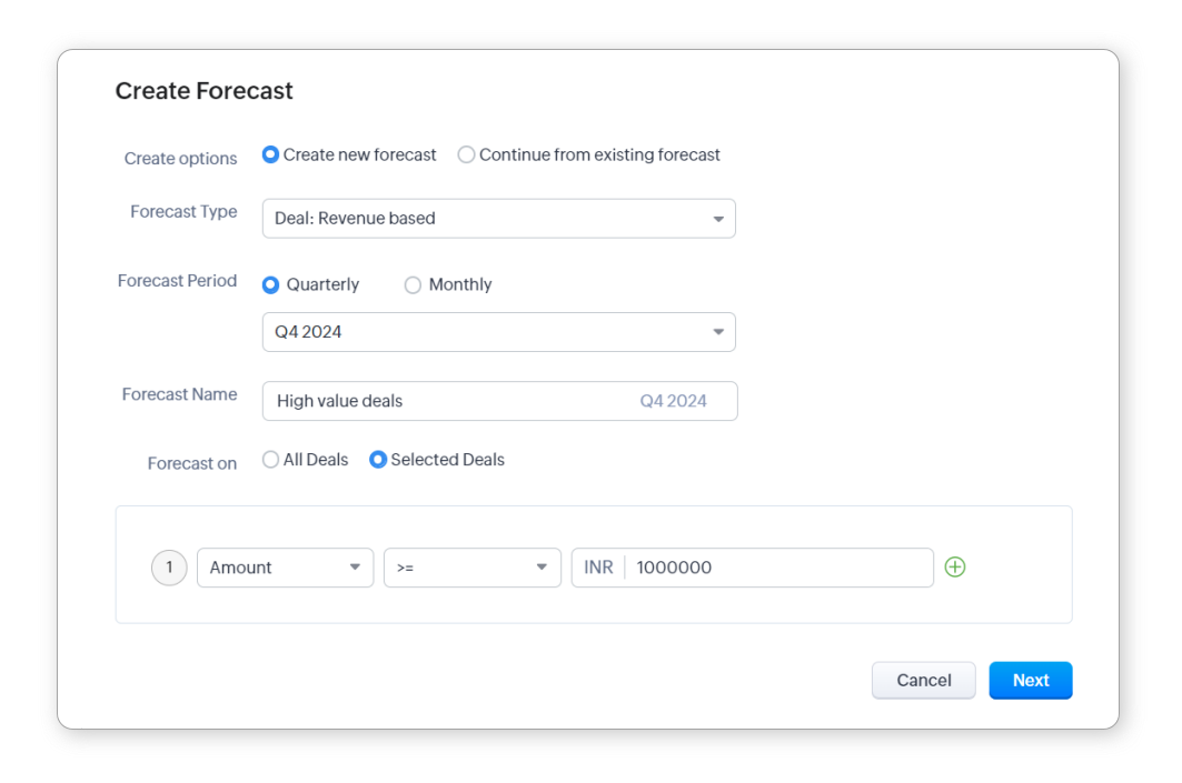 Condition-based forecasting: To estimate the marketing budget for premium deals, you should find the revenue that will be generated from these deals. While creating a forecast, you must set the conditions such that only premium deals are considered.
