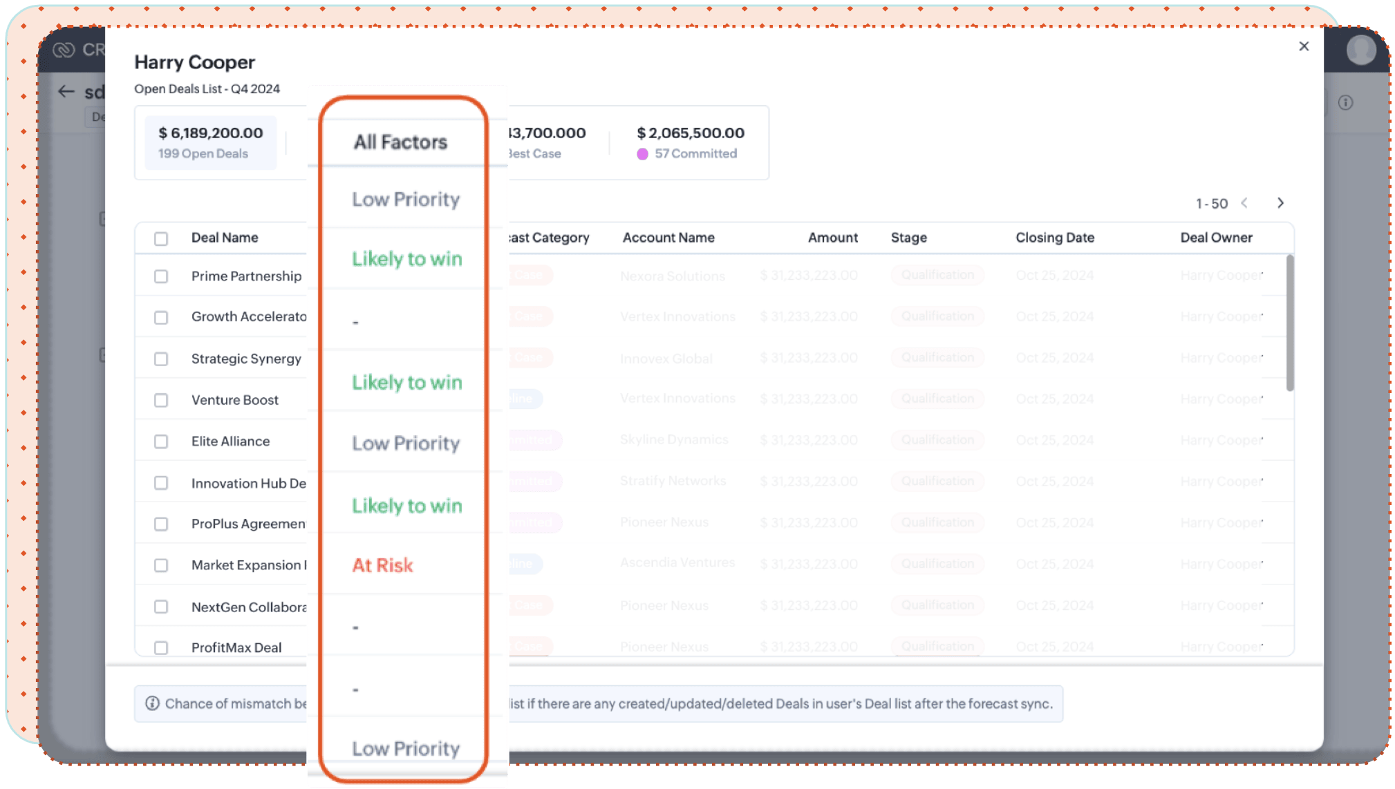 - If a deal is labeled as low priority, it means this deal is at the early stage, and it will take time to close and will likely not happen in this forecast period. This type of deal won't bring in revenue for this forecast period, and the rep can focus on high priority deals for the moment.