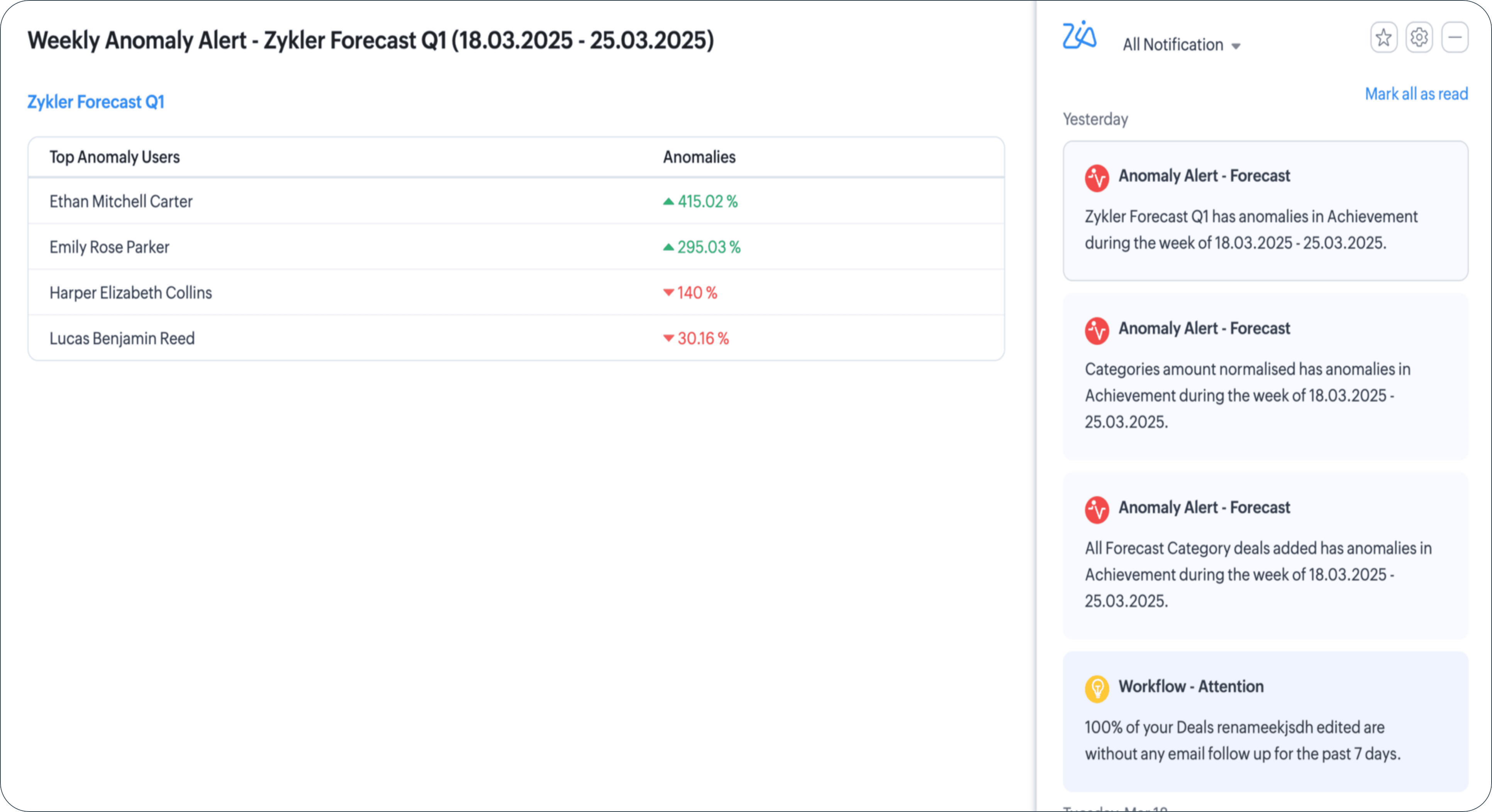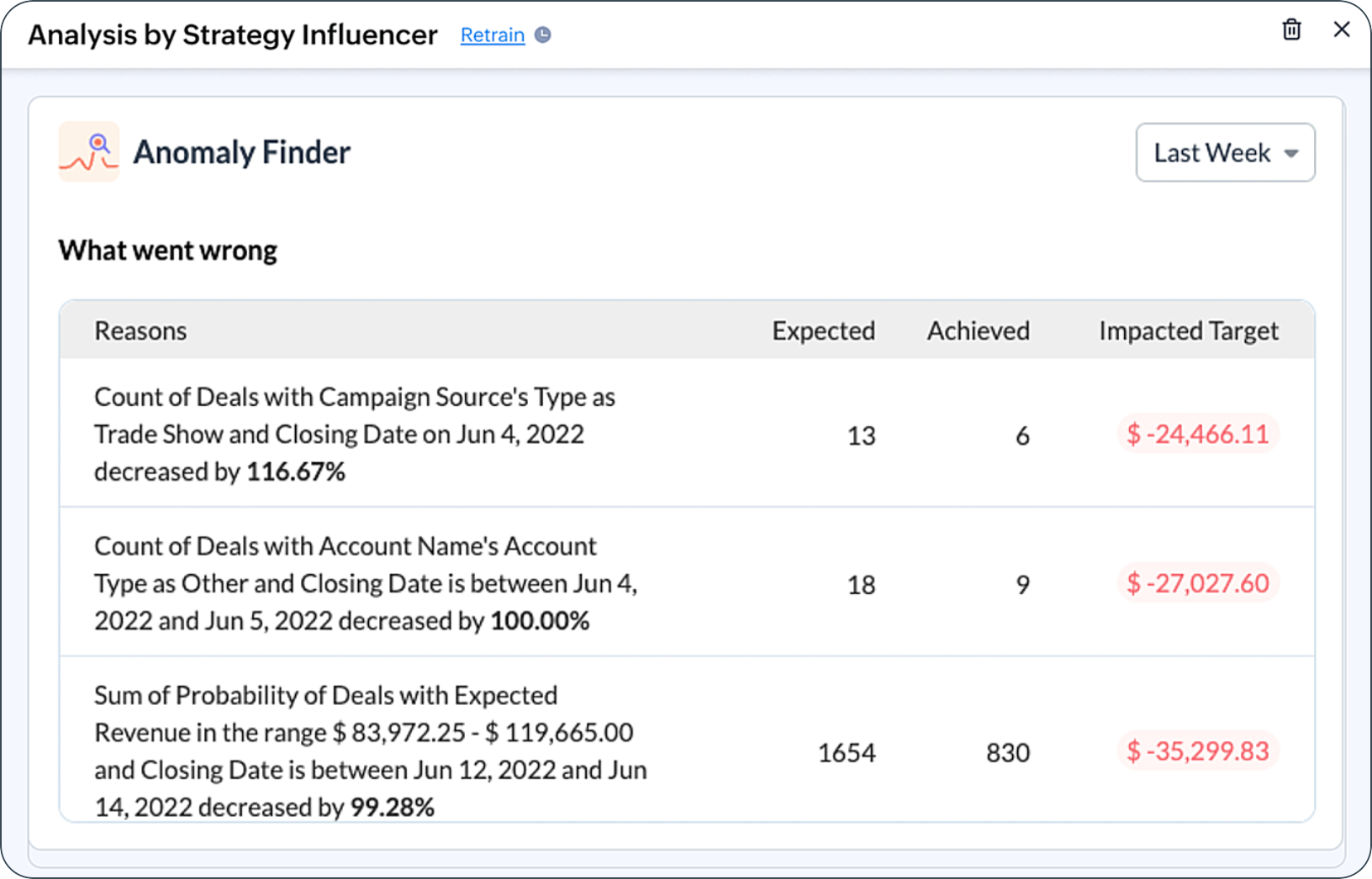 Anomaly Finder scrutinizes the presence of anomalies in the attained value for a given period, and elaborates on the factors behind them, the anticipated versus actual targets, and the extent of their influence on the target.