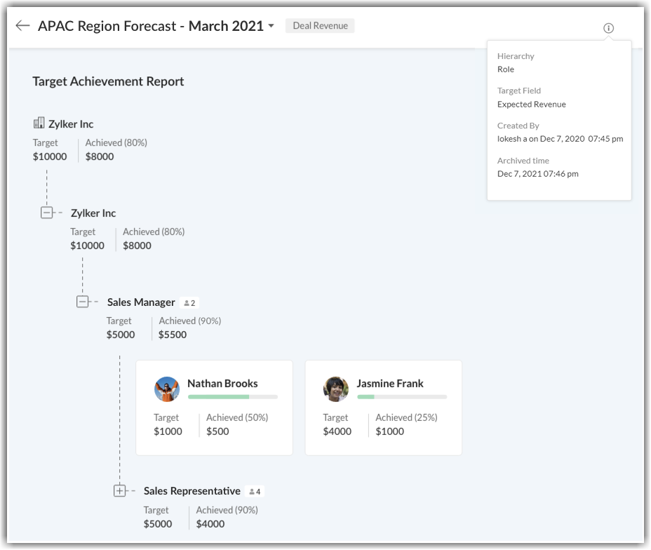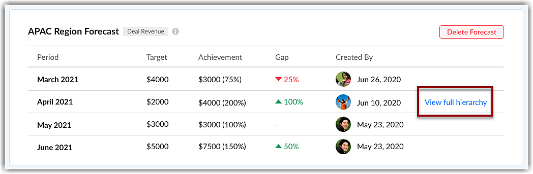 Irrespective of the type of hierarchy you have chosen: Role-based, reporting-based, or territory-based, your forecast replicates the hierarchy you have created in your organization.
