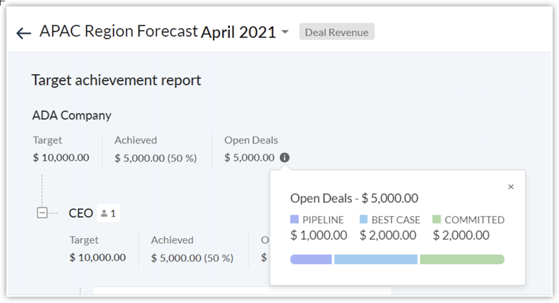 - The adjusted value will be reflected/rolled-up in the open deal revenue of all the hierarchies higher-up and the adjustment switch will be displayed to indicate the overall adjustments.