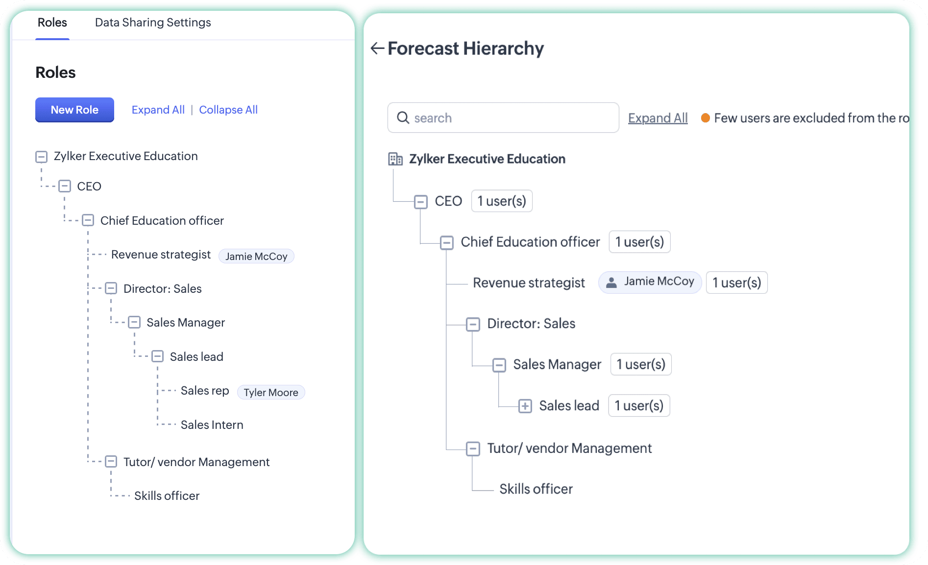 Hierarchical structure with excluded users is denoted with an orange dot for visual cognizance. And, for role-based and territory-based hierarchy, the exclusion of a role or territory as a whole is indicated explicitly by means of the 'excluded' tag.