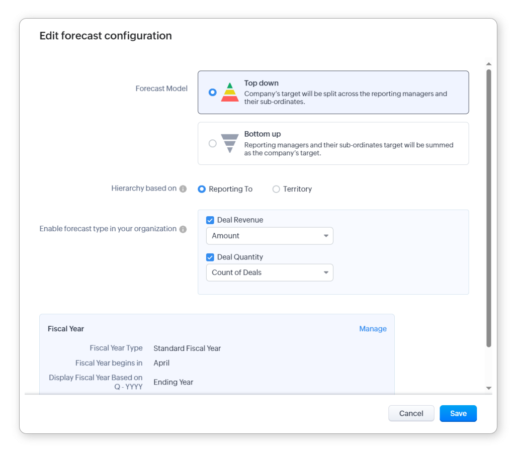 In Zoho CRM, forecast configuration is the foundation for all the forecasts you will be creating. In other words, the forecast model, fiscal year, field used for forecast estimation, and so on will apply to all the forecasts that you create in Zoho CRM. This can only be set by users with admin profiles.