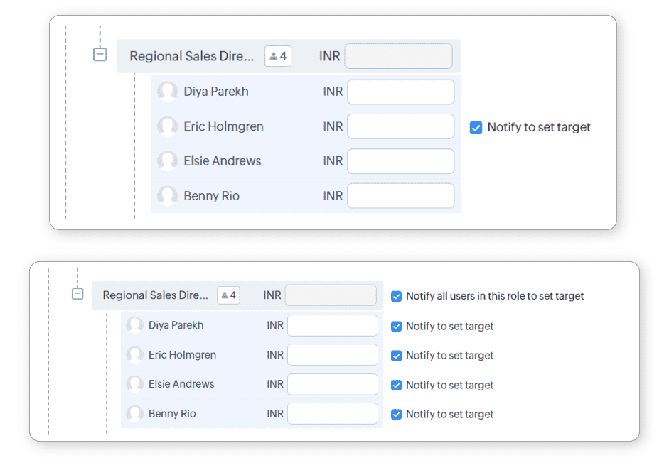 How are targets assigned: Depending on your business model, you can either have a role, reporting, or territory-based hierarchy. You can set targets for one of the following hierarchies at a given time:
