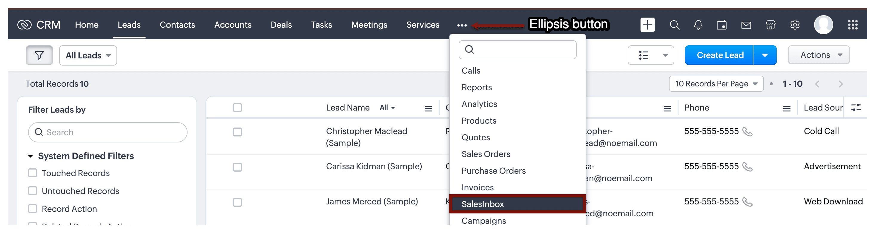 Once enabled, SalesInbox will appear in the Modules section. You can access it by clicking the ellipsis icon in the top bar to find SalesInbox in the module list.