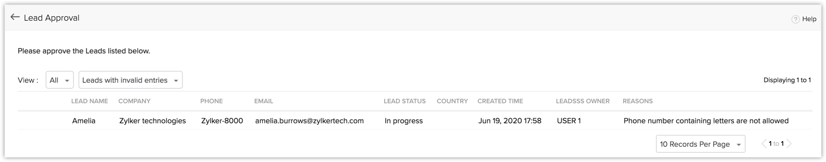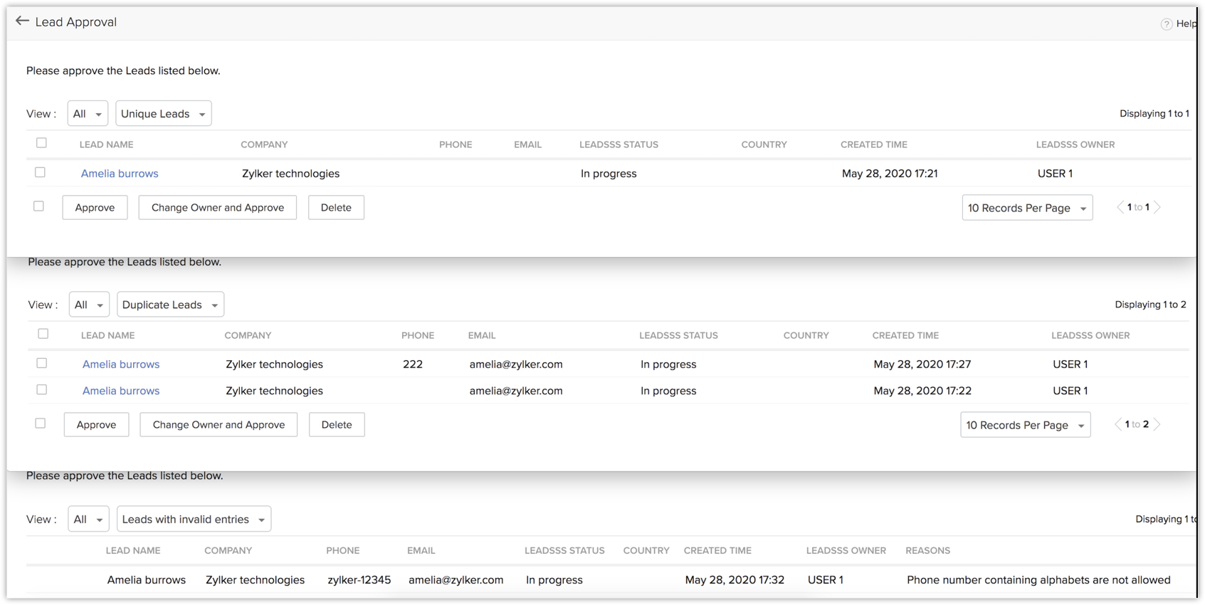 - If a record is found to be a duplicate based on its unique field in the CRM, it will automatically be moved to the Approve Leads section, under either Duplicate Leads or Invalid Entries, even if lead approval is disabled. This is due to CRM validating records according to the validation rules and unique field properties you have set.
