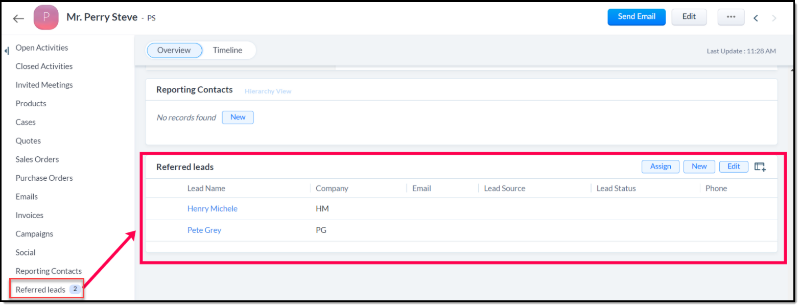 - Click on the reference link in the Related list on the left tab (Referred leads). The reference tab displays all previously referred leads, or it is blank if none have been linked.