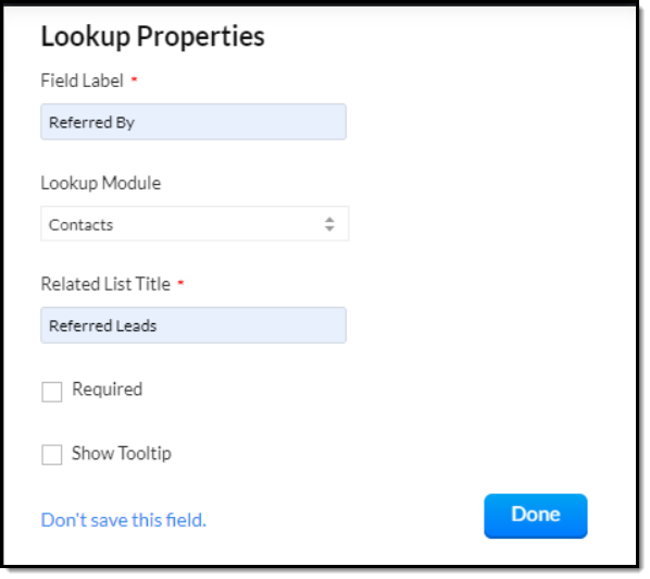 In Zoho CRM, you can establish referral association using what we call a lookup field, whose principal function is to establish a link between two separate modules. Let's look at how to create a lookup field.