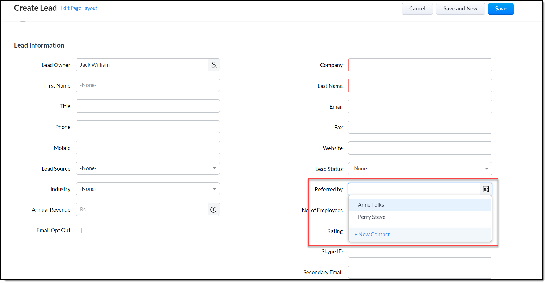 For example, here, while you add a lead, you see a lookup field called "Referred by", from which you can pick the customer that referred your business to this lead.