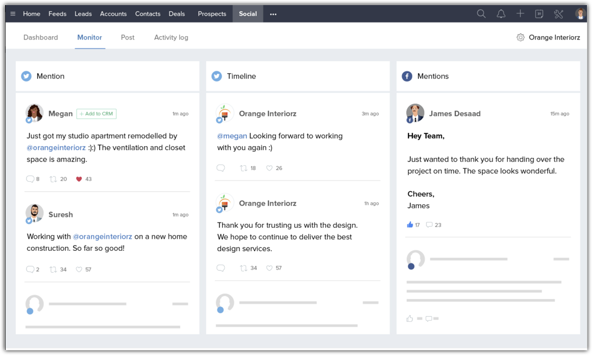 Facebook and Twitter are their major sources of lead generation. They monitor the tweets, likes, comments, and posts and also new updates and information through these handles from their CRM platform. This allows them to identify any positive social activity such as likes, mentions, tweets, retweets, messages, posts, and comments and add the person's details as a lead in CRM. The sales team is automatically notified about the new lead and gets in touch with them to acquire further details. Once the team is assured that the client is interested in doing business with them, the sales qualified lead is passed on to the design consultants.