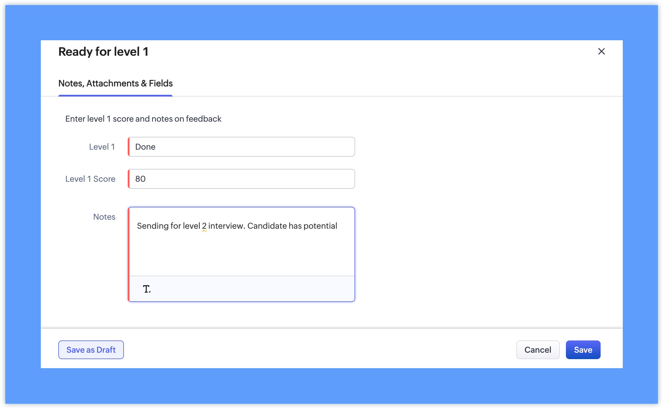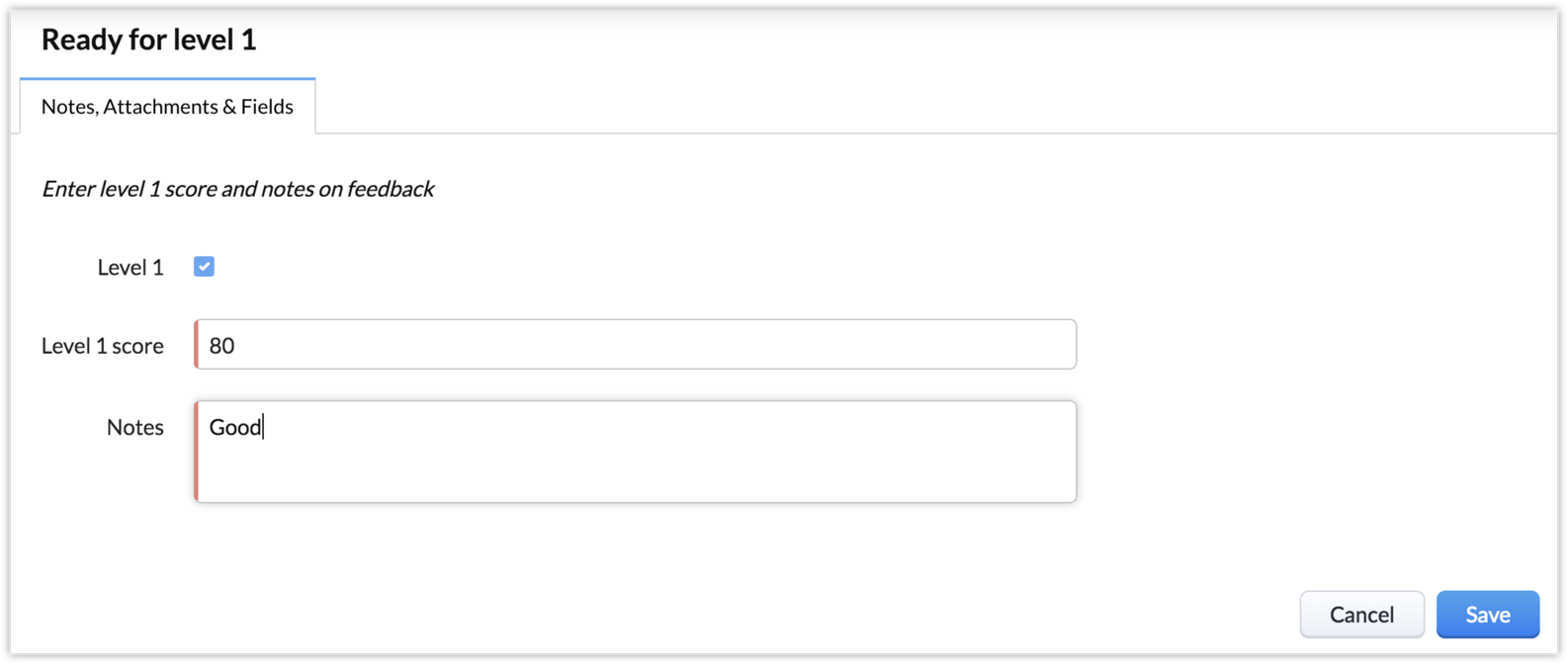 Insert Message Enter level 1 score and notes on feedback Add Fields: Level 1 Level 1 score Select Make Notes as Mandatory |