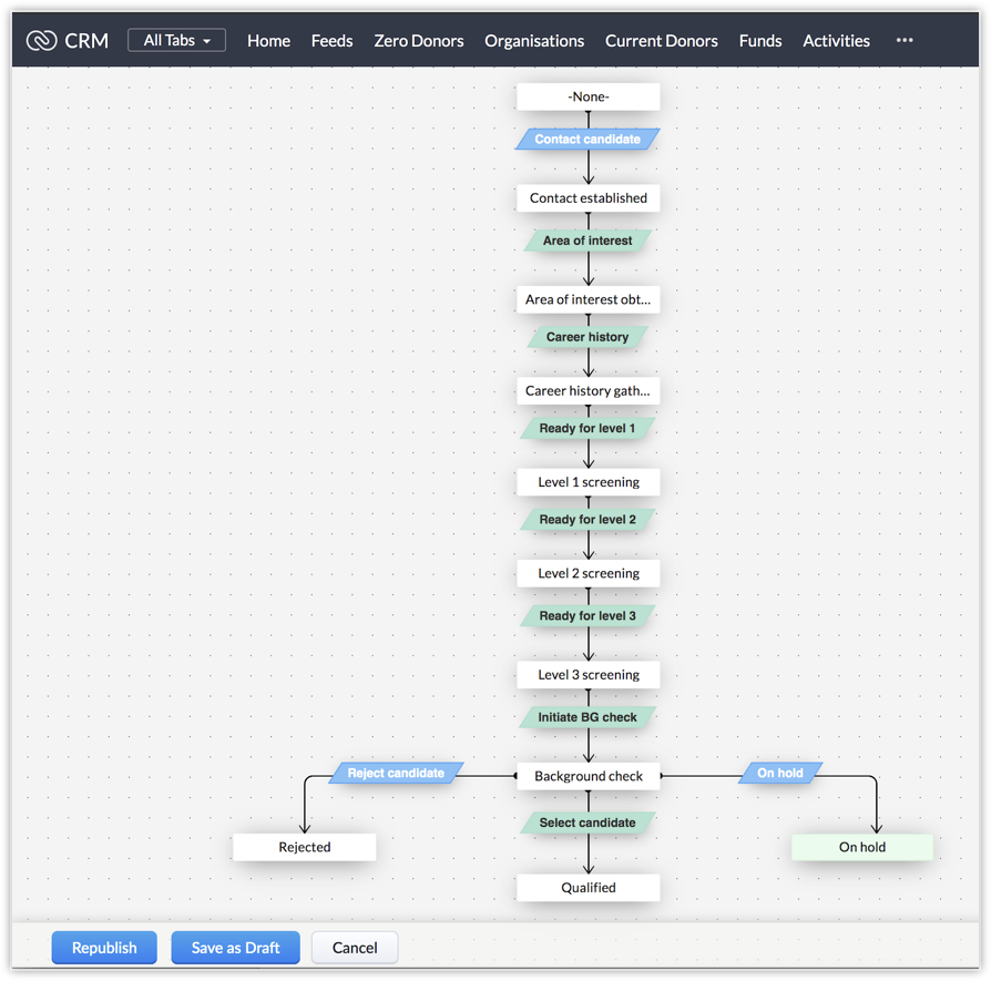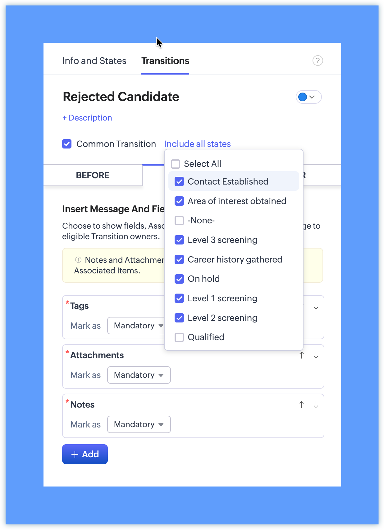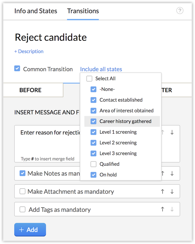 Make the following Transitions, common transitions. That is, a transition that is accessible from any state in the Blueprint. For instance, making "Reject Candidate" a common transition would mean that you will be able to drop this candidate from the recruitment process even from "BG Check" stage or "Career history" stage, if you find that they are not qualified to proceed further. On that note, the following transitions will be required for you at any stage in the Blueprint, hence you can make these "common transitions"