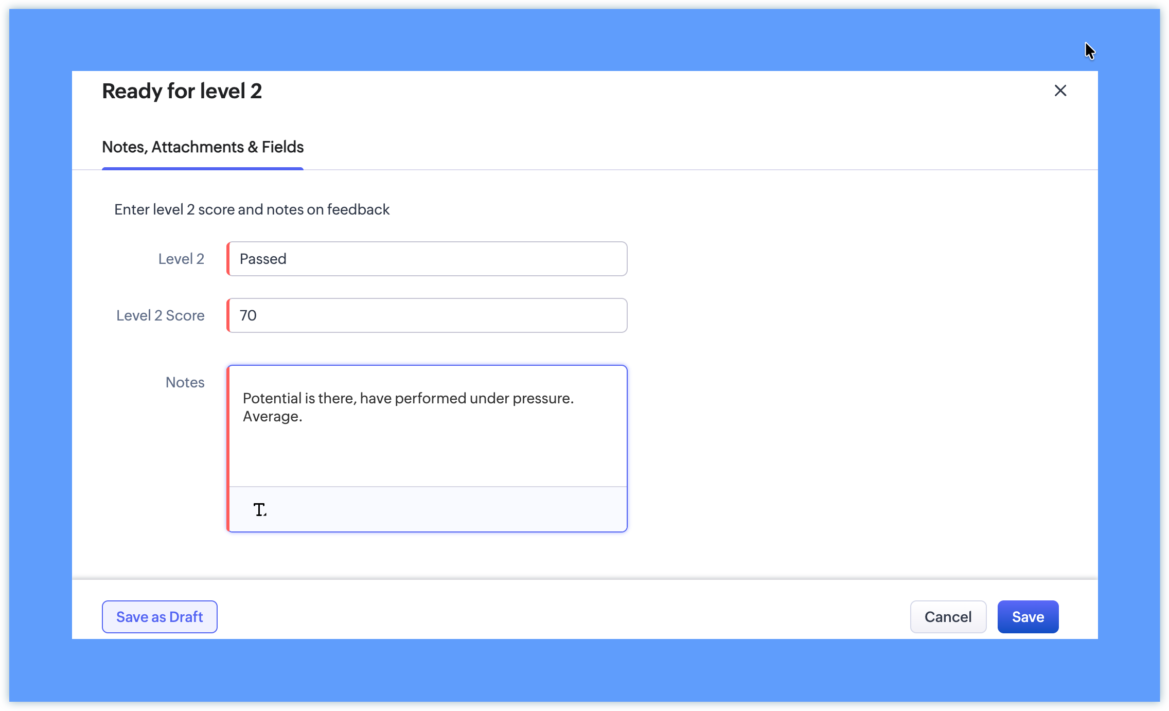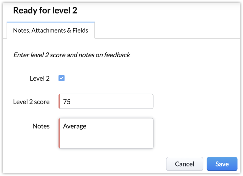 Insert Message Enter level 2 score and notes on feedback Add Fields: Level 2 Level 2 score Select Make Notes as Mandatory |