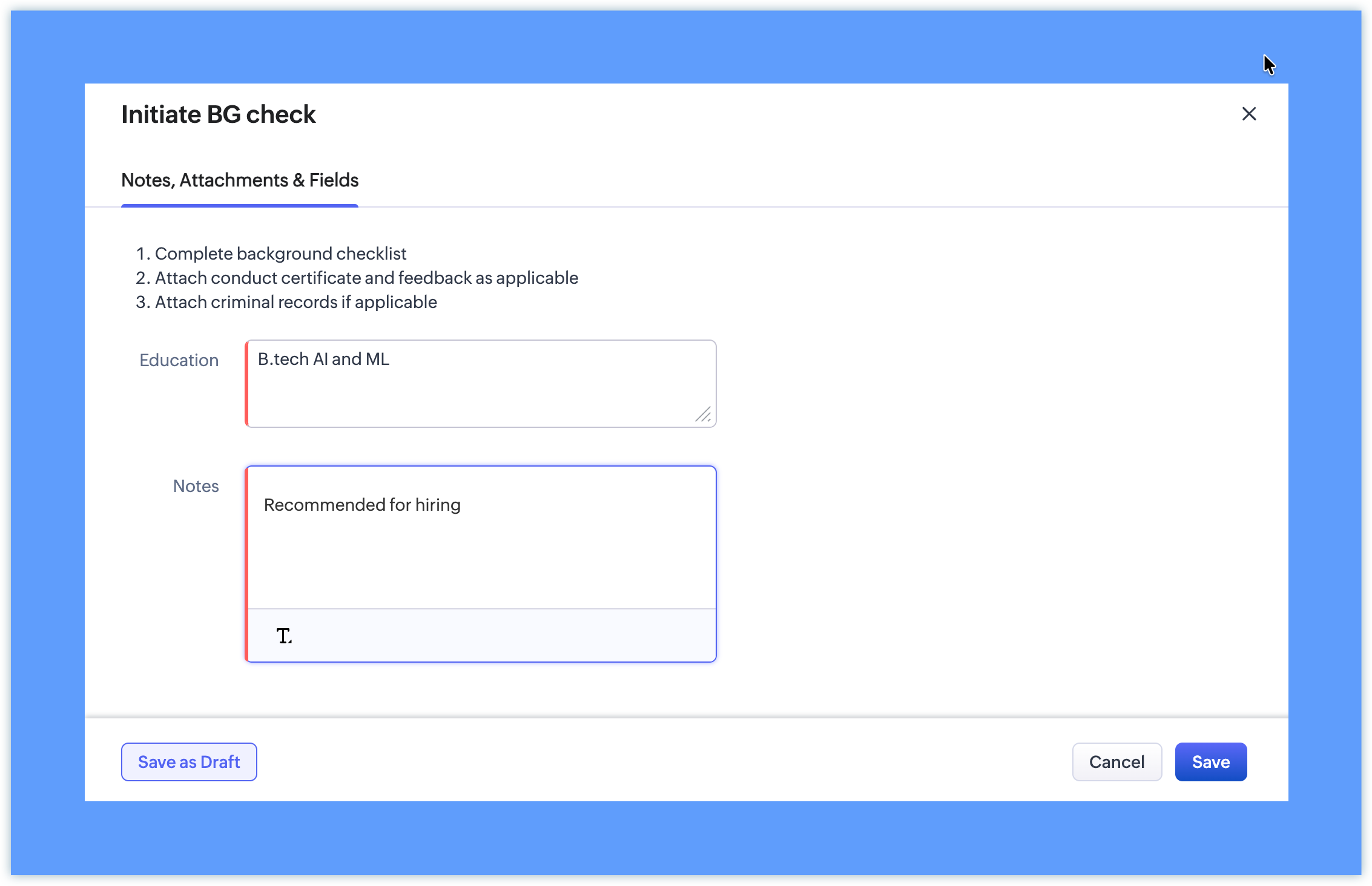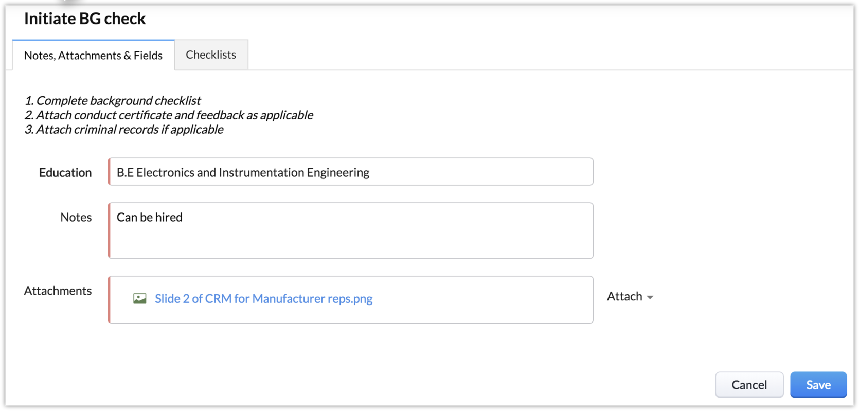 Insert Message 1. Complete background checklist Add Fields: Education Add Checklist: - Education - Employment history if applicable - Feedback from previous employer - Criminal records if any - Conduct certificate from reliable source Select Make Notes as Mandatory Select Make Attachments as Mandatory |