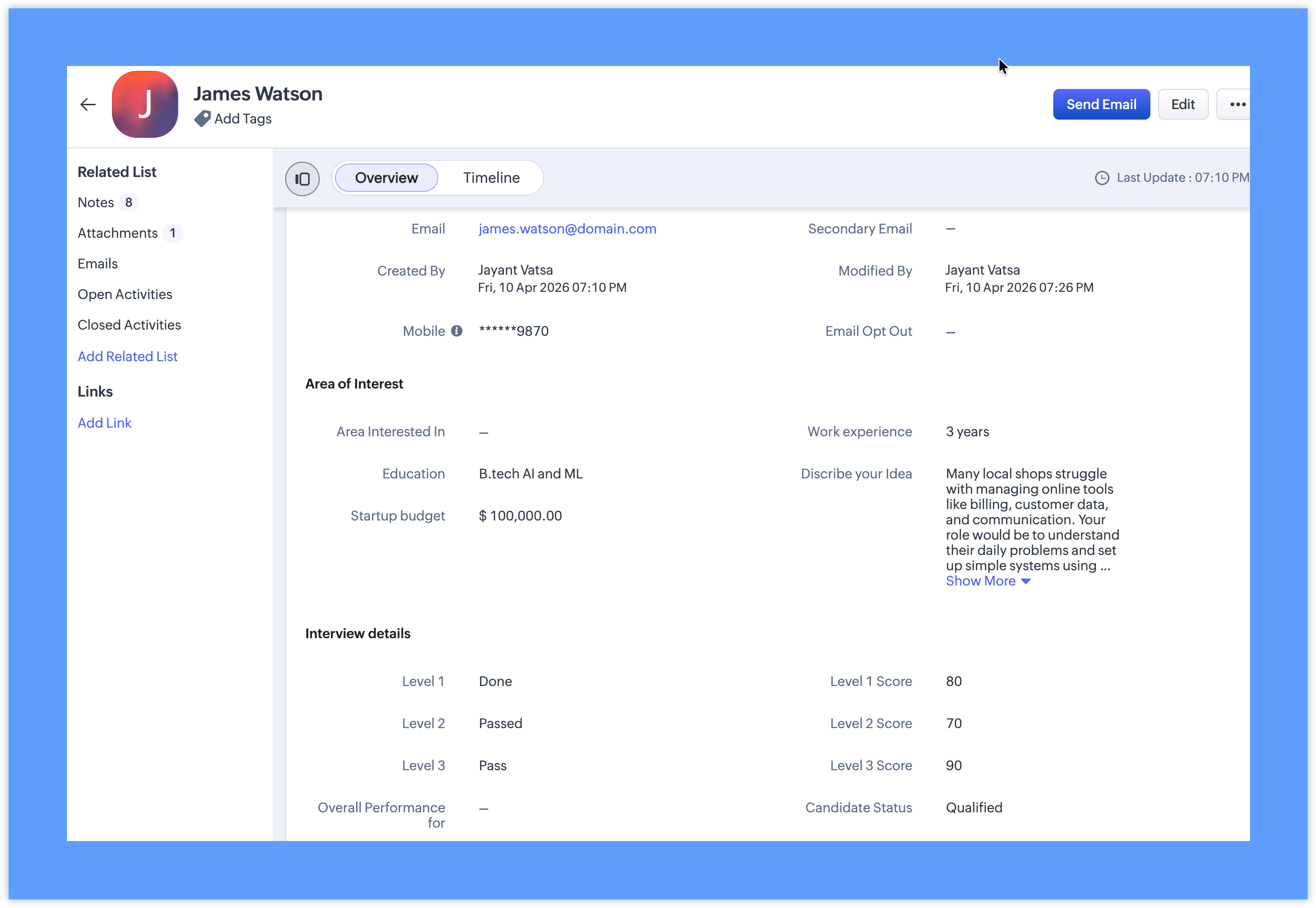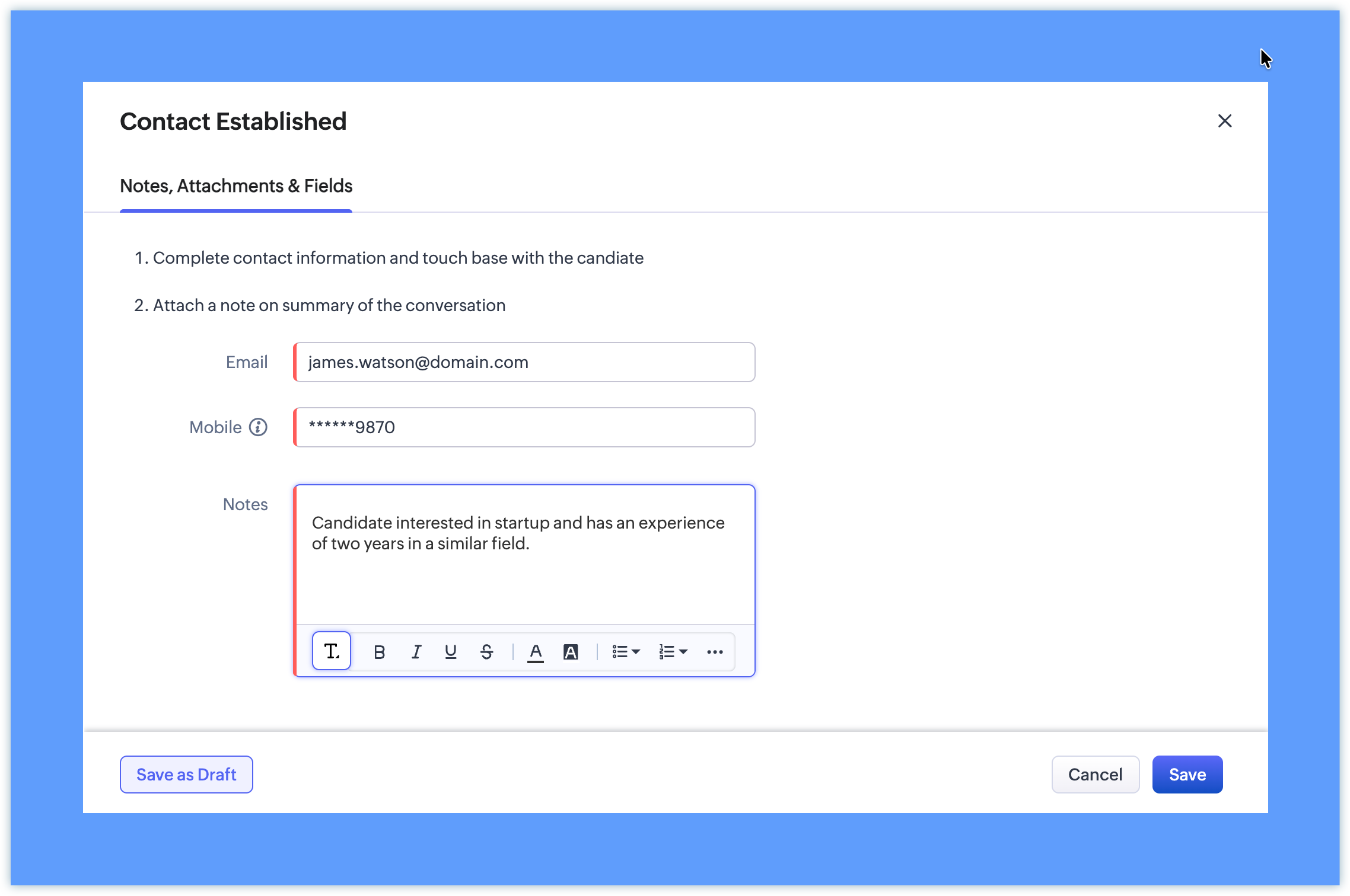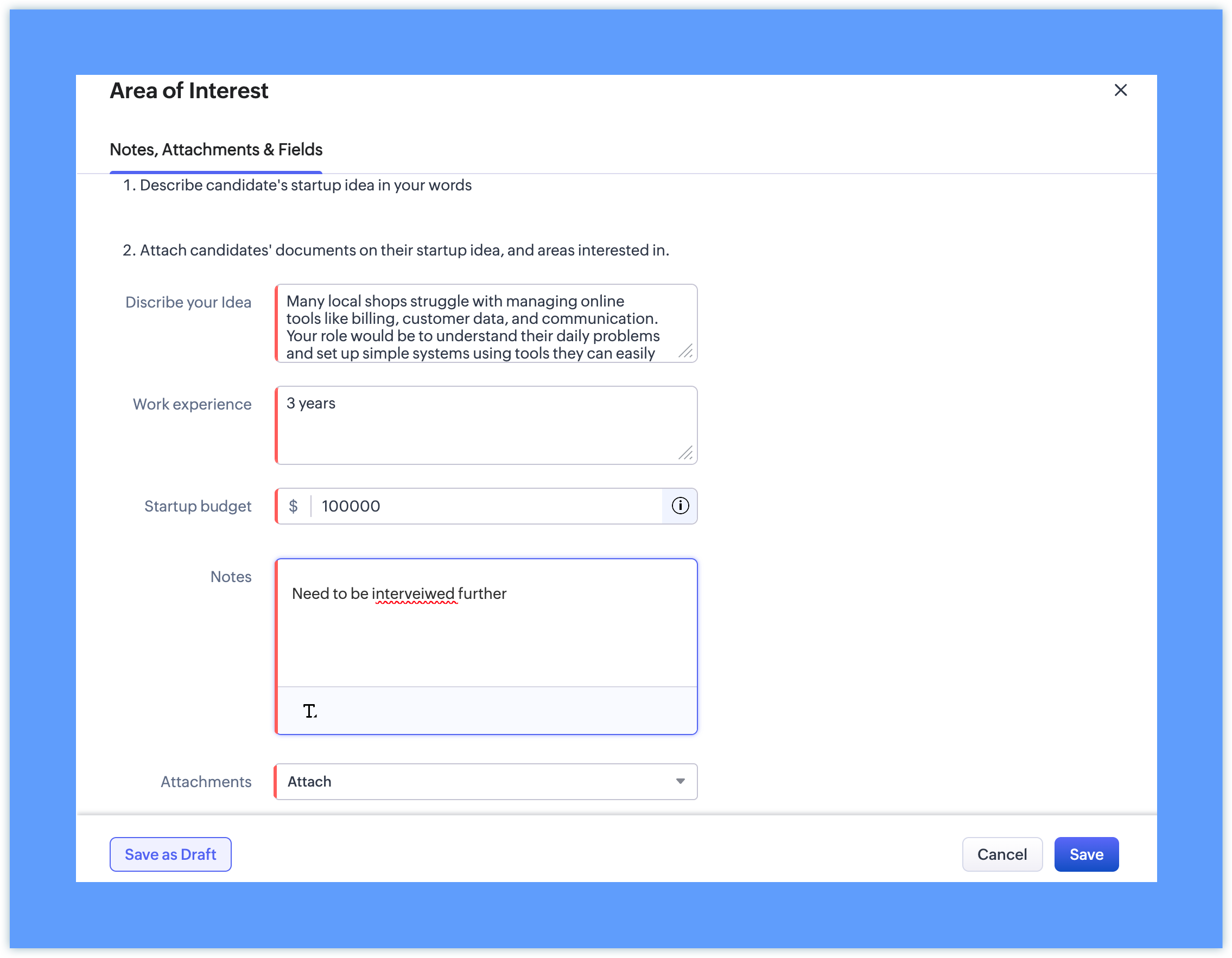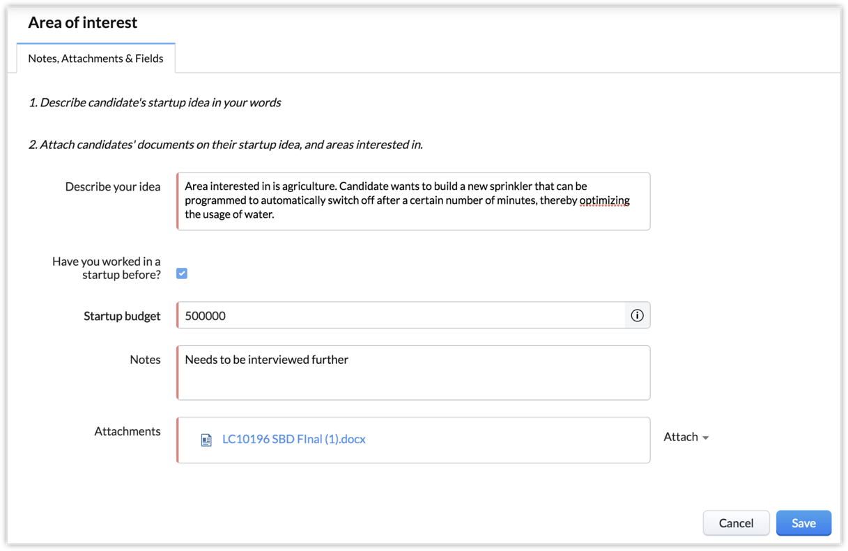 Insert Message: 1. Describe candidate's startup idea in your words Add Fields: - Describe your idea - Have you worked in a startup before? - Startup budget Select Make Notes as Mandatory Select Make Attachments as Mandatory |