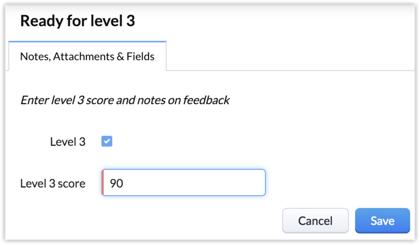 Insert Message Enter level 3 score and notes on feedback Add Fields: Level 3 Level 3 score Select Make Notes as Mandatory |