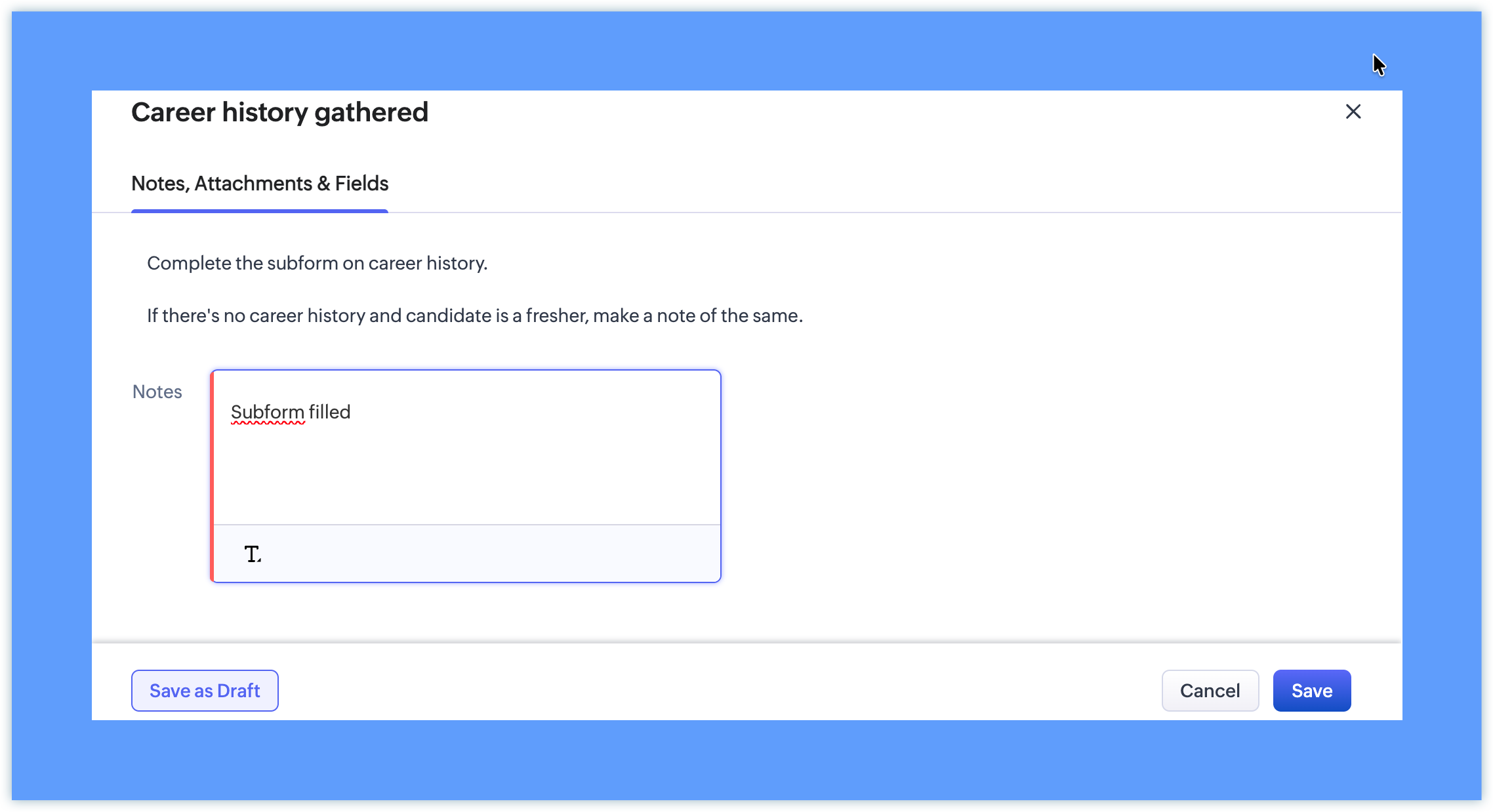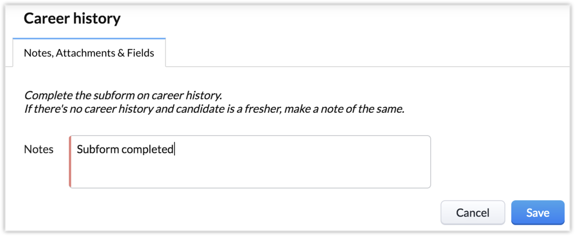 Insert Message Complete the subform on career history. If there's no career history and candidate is a fresher, make a note of the same. Select Make Notes as Mandatory |