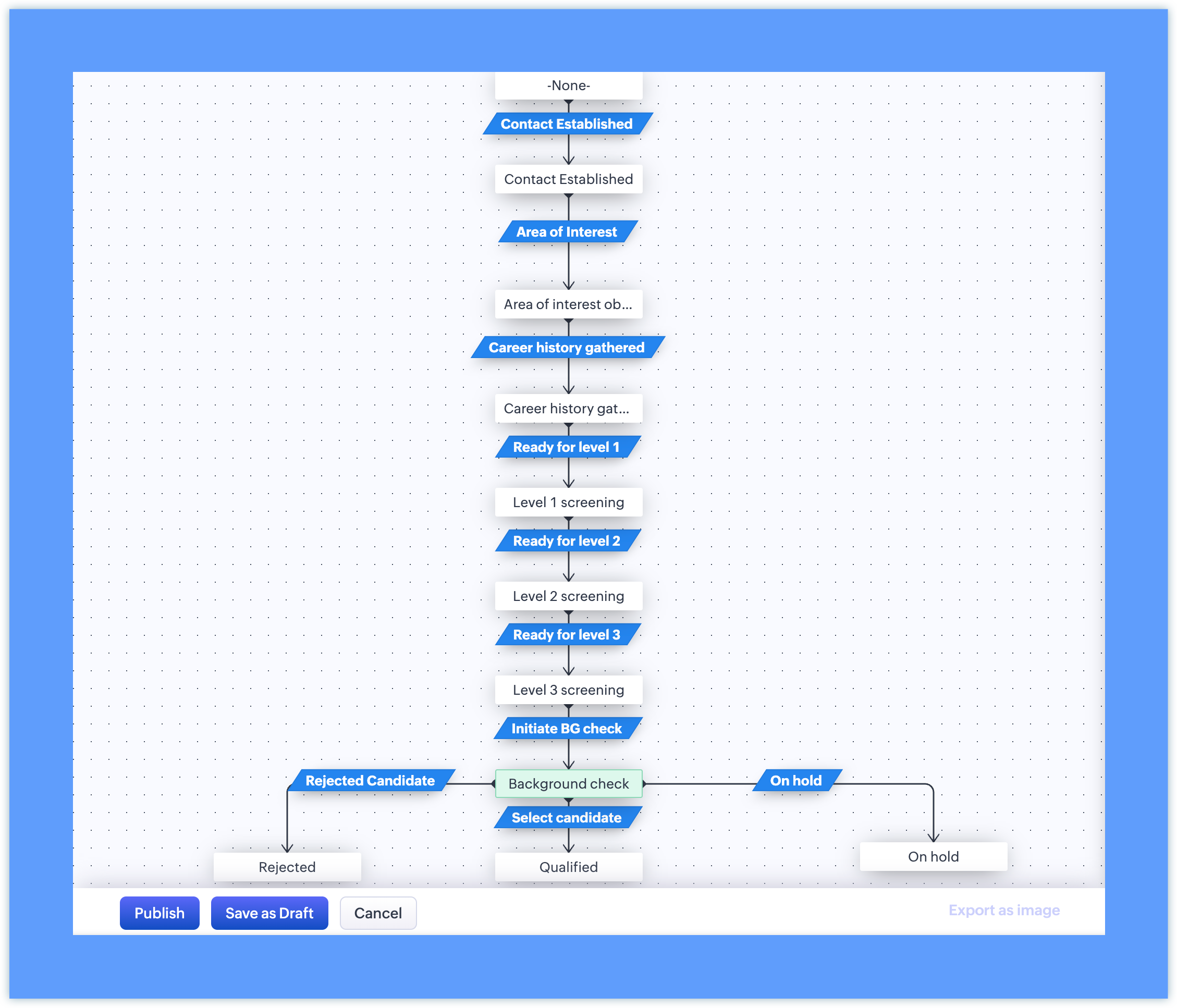 Note: The Candidate Status field should have the following stages (picklist values):Following are the Transition settings for each transition: