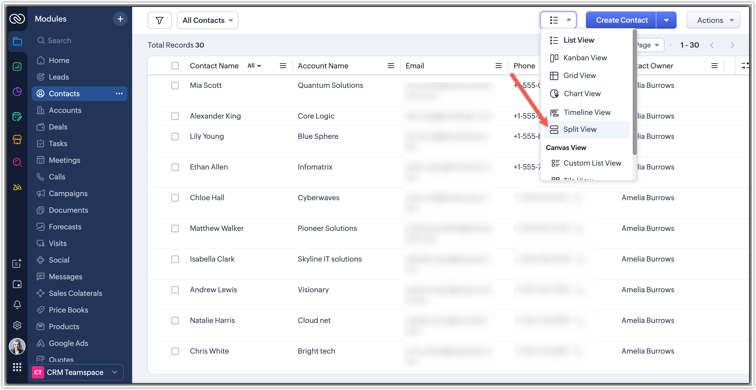 Split View is available for modules supporting list views in Zoho CRM's NextGen UI, including:
