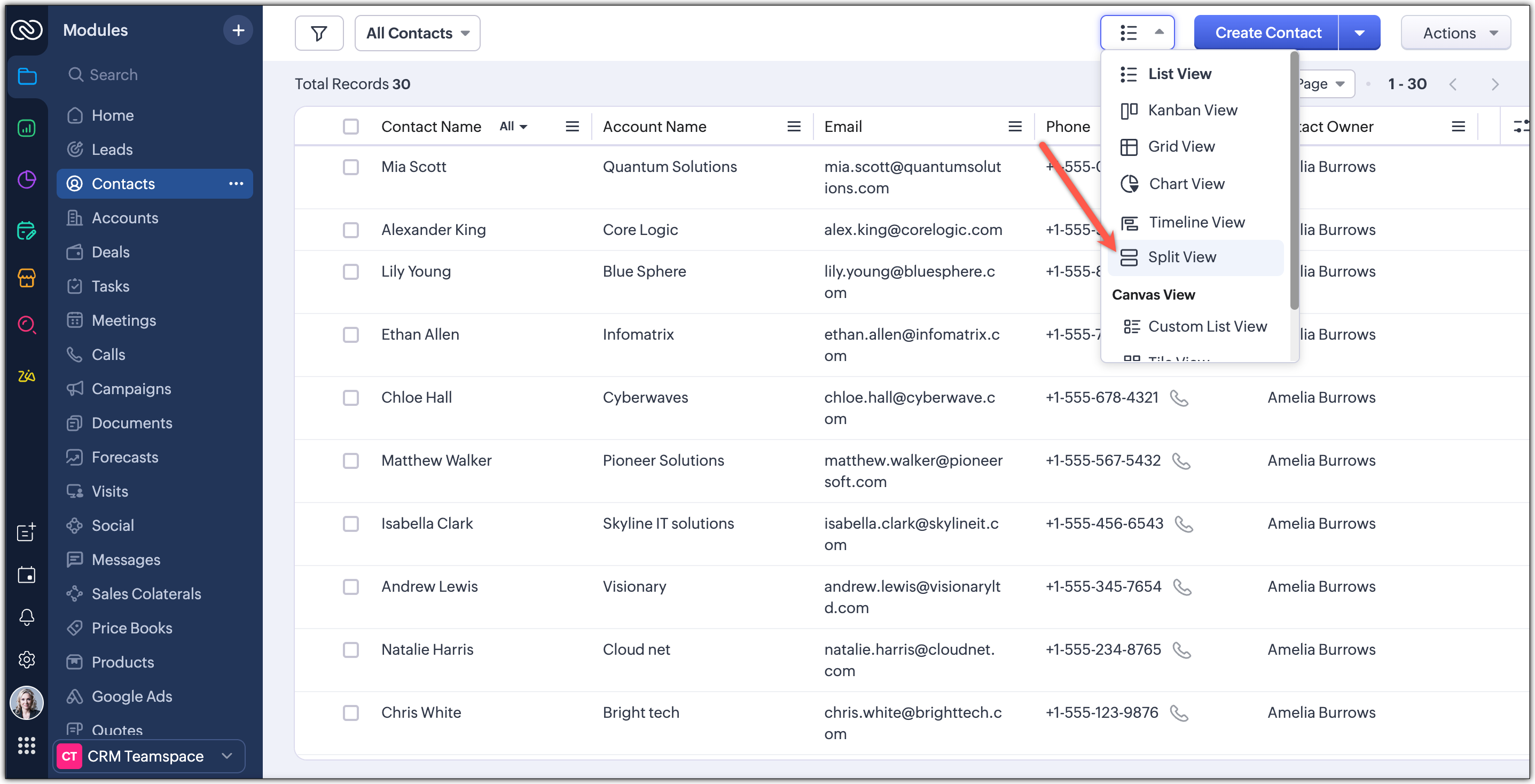 Split View is a module view in Zoho CRM’s NextGen UI that gives users the power to break down large sets of records into smaller, categorized tables—based on a specific field such as a picklist, user, or any defined criteria. This layout allows users to interact with multiple sets of data side-by-side, providing a more contextual, clutter-free, and actionable interface.