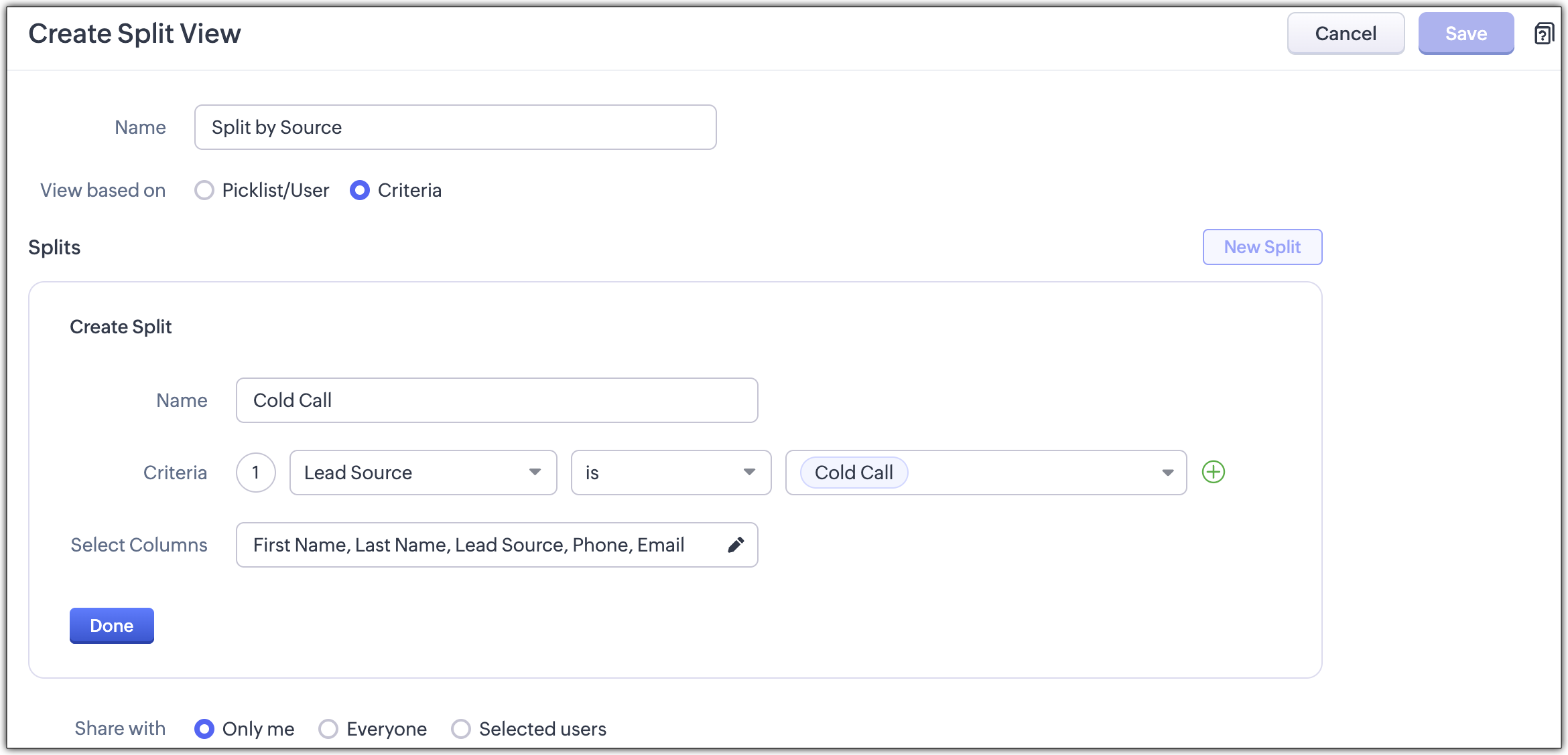 - If you've chosen to split by criteria, enter the split name, choose the criteria and select columns. Click New Split to add more segments to the view.