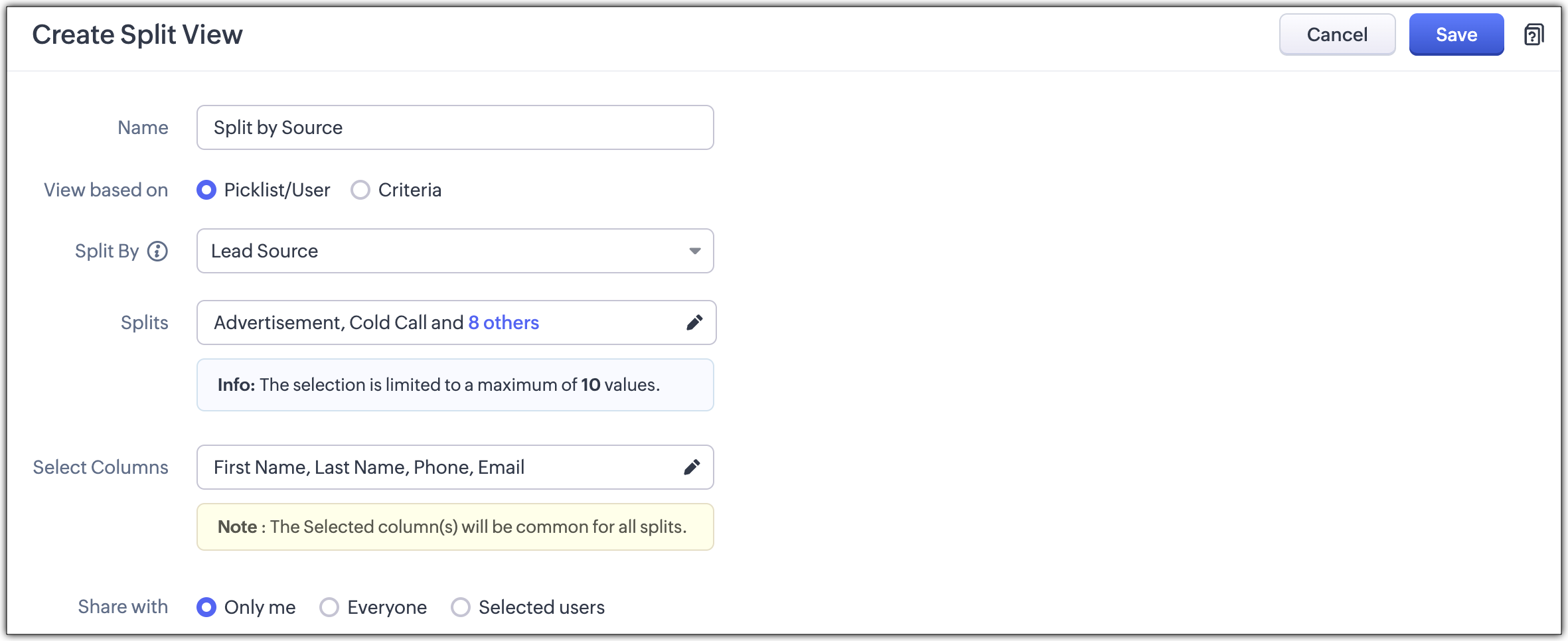 * This is a common setting for all splits and cannot be changed for individual splits. - Select a categorical field - Picklist / User or Criteria to define how records are split.
