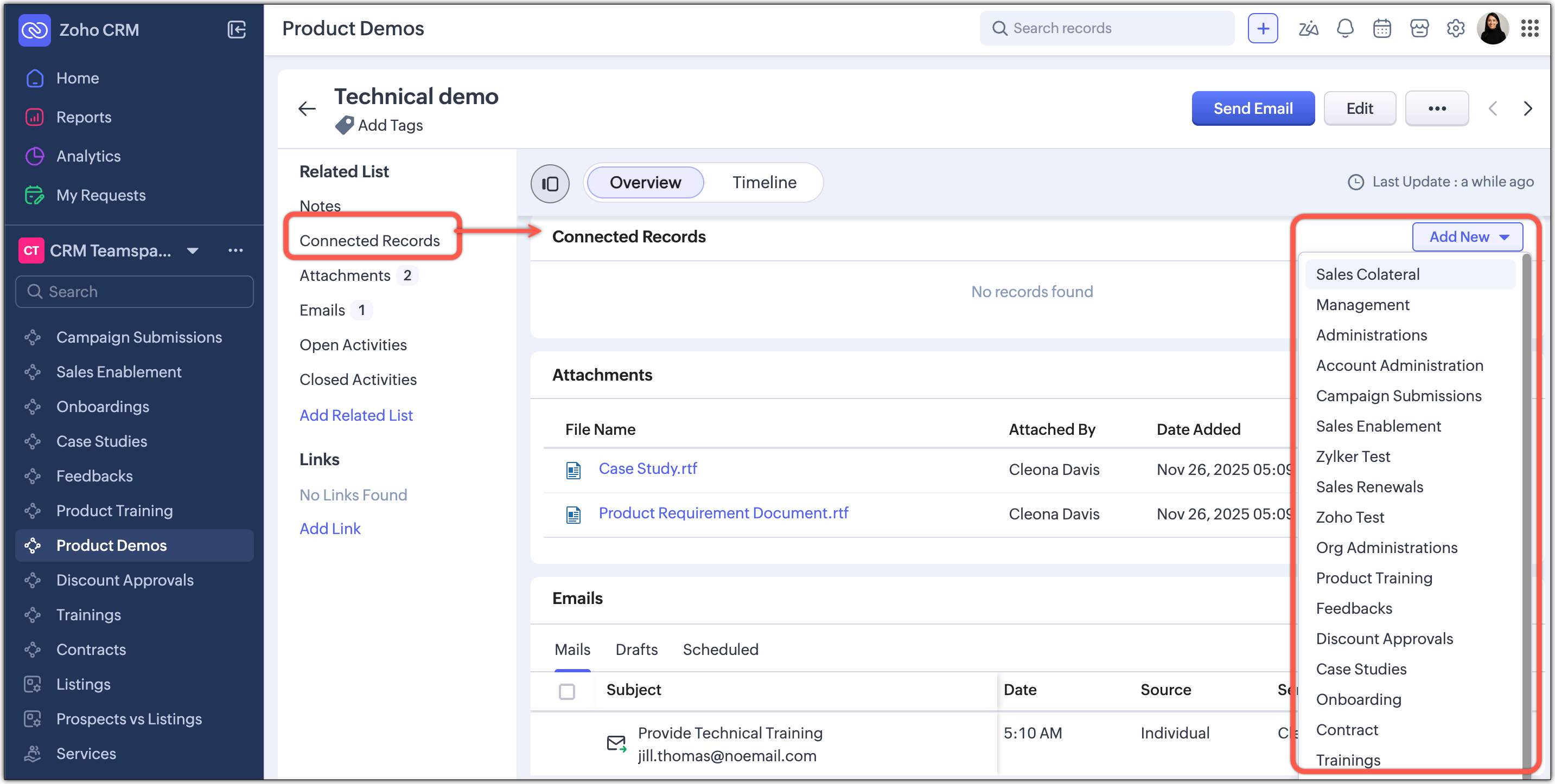 Connected records help establish connections instantly between two modules in your CRM system by seamless linking of records within those modules. With this feature, you can achieve a unified view of interactions and relationships across records created in your CRM account. It can help you gain better insights, streamline processes, and achieve collaboration by bridging the gap between team modules and organization modules.
