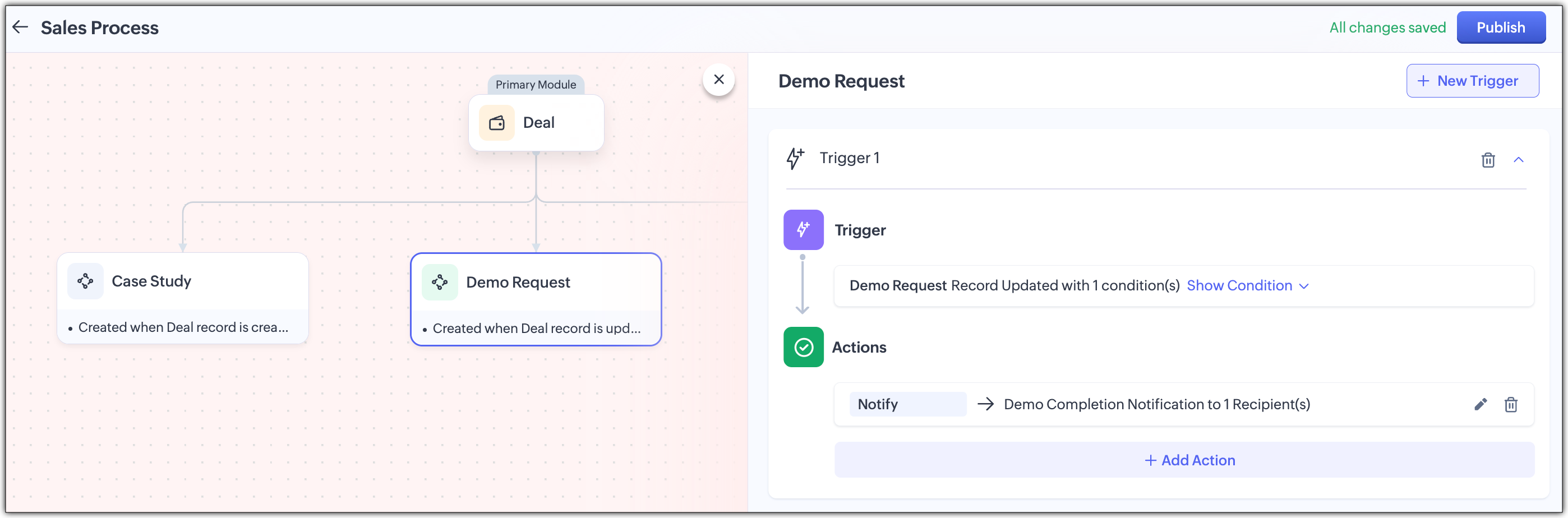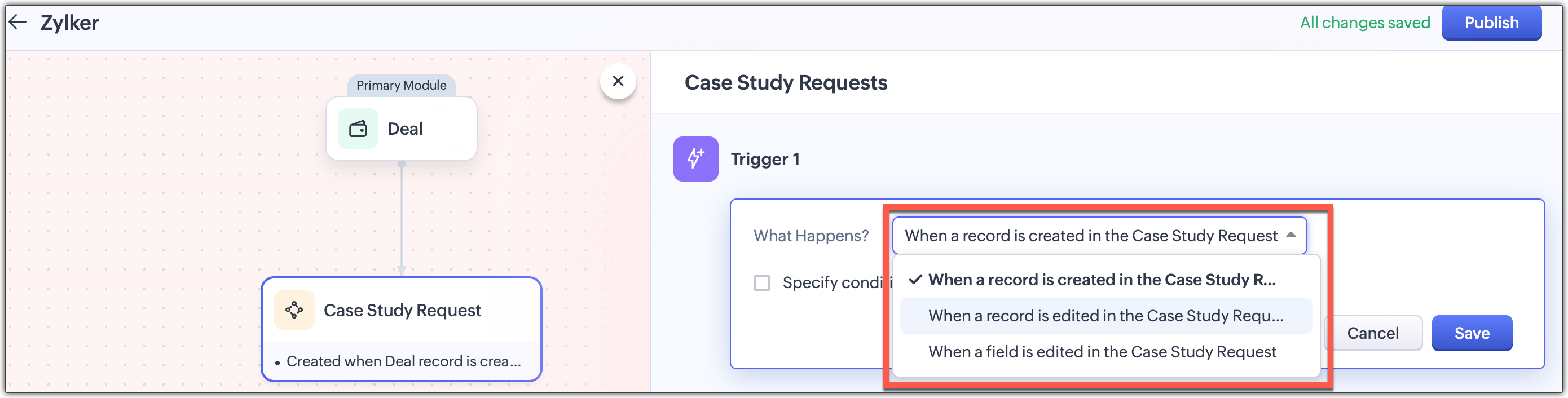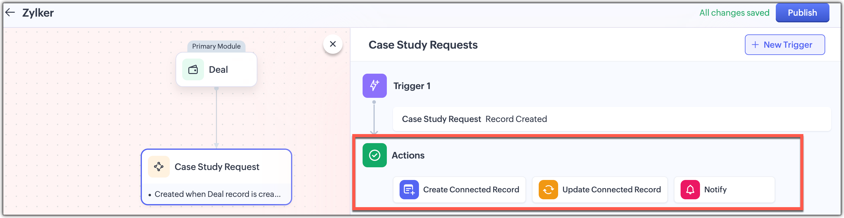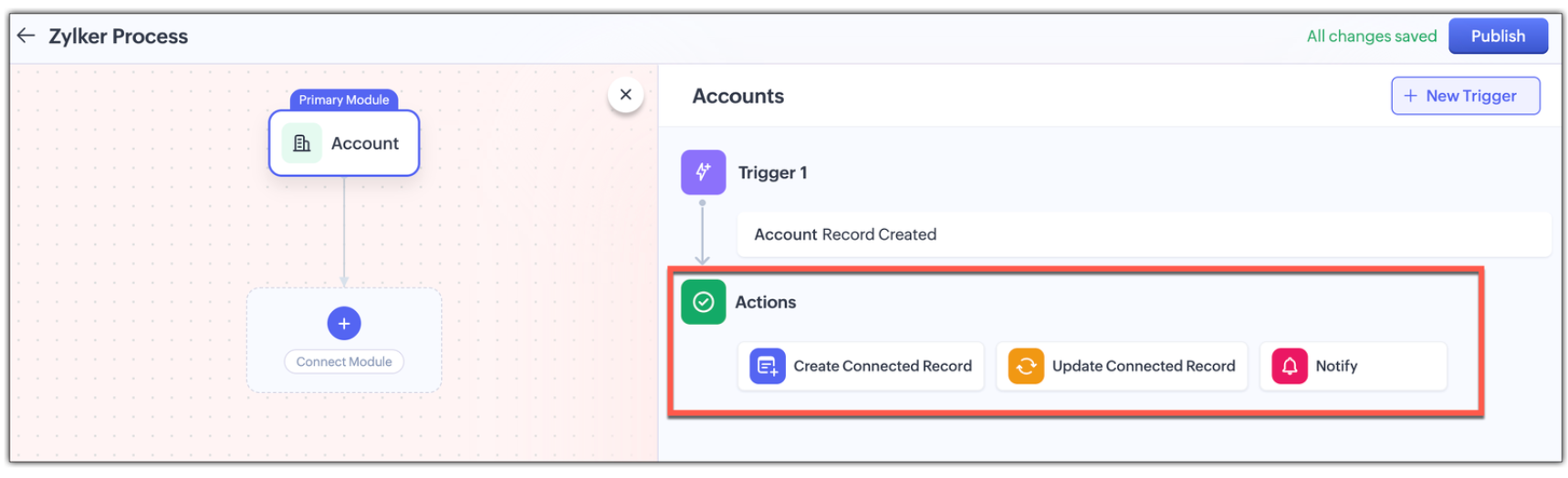 A connected workflow begins with setting up triggers to initiate the process. You can configure a single trigger or multiple triggers for a module. In case you need to configure multiple triggers for any other related modules, you can do so by defining specific conditions. The triggers are :