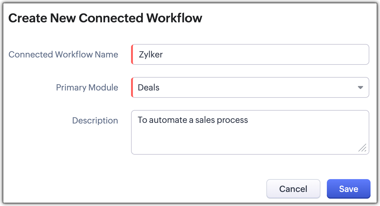 - Enter the workflow name, choose a Primary Module, and enter a description if needed. The primary module can be an Organization Module (like Deals) or a Team Module. This is where the workflow begins.