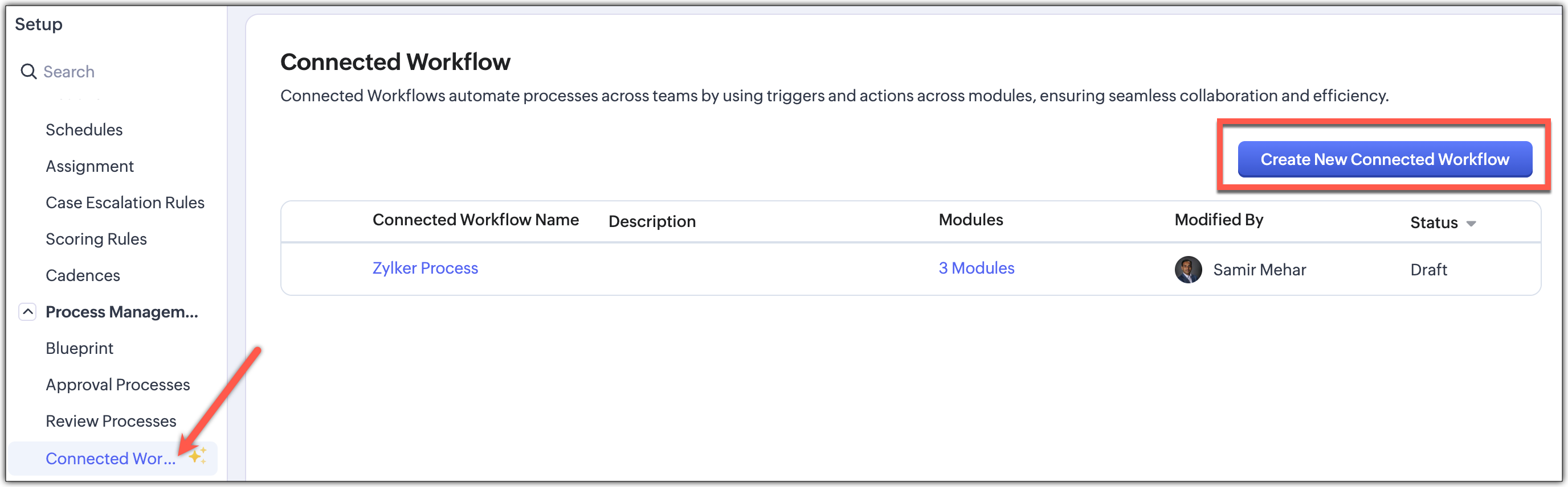 - Navigate to Settings, choose Process Management, and click Connected Workflows.