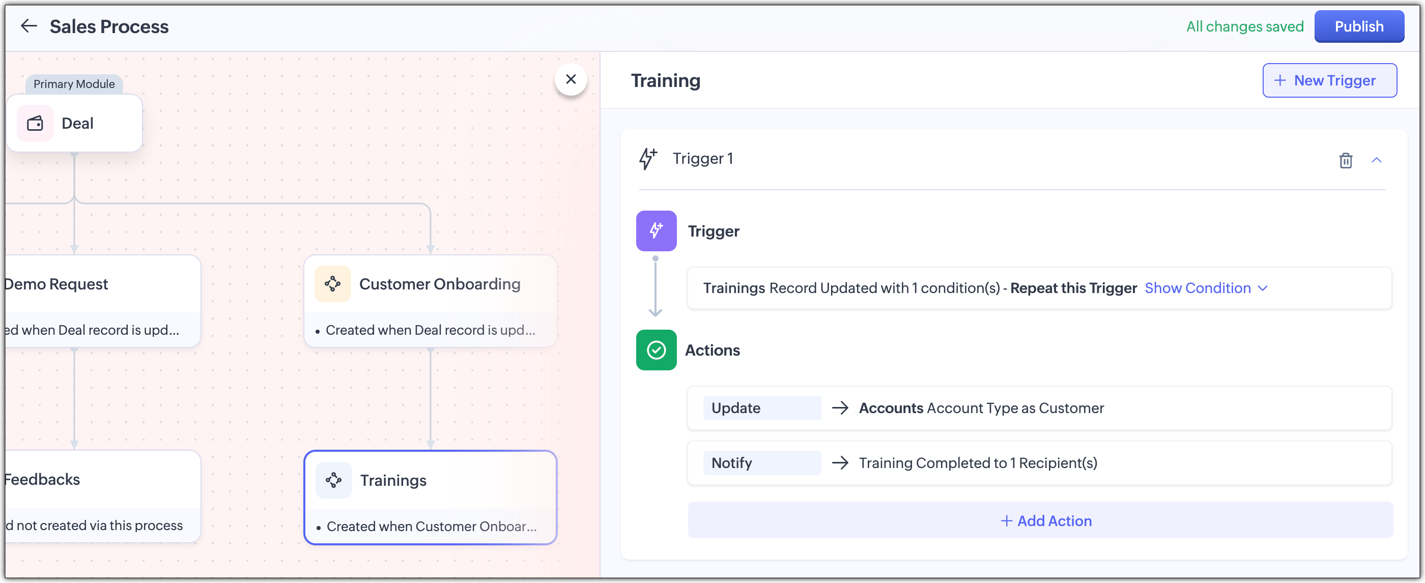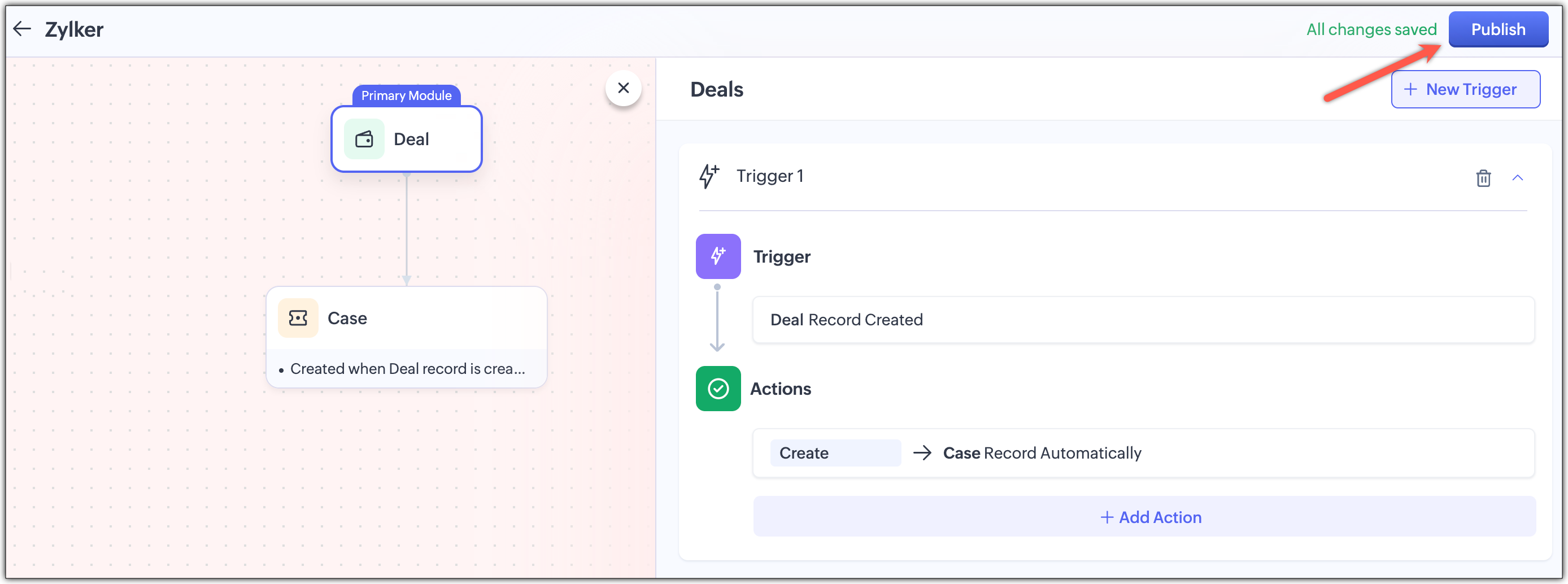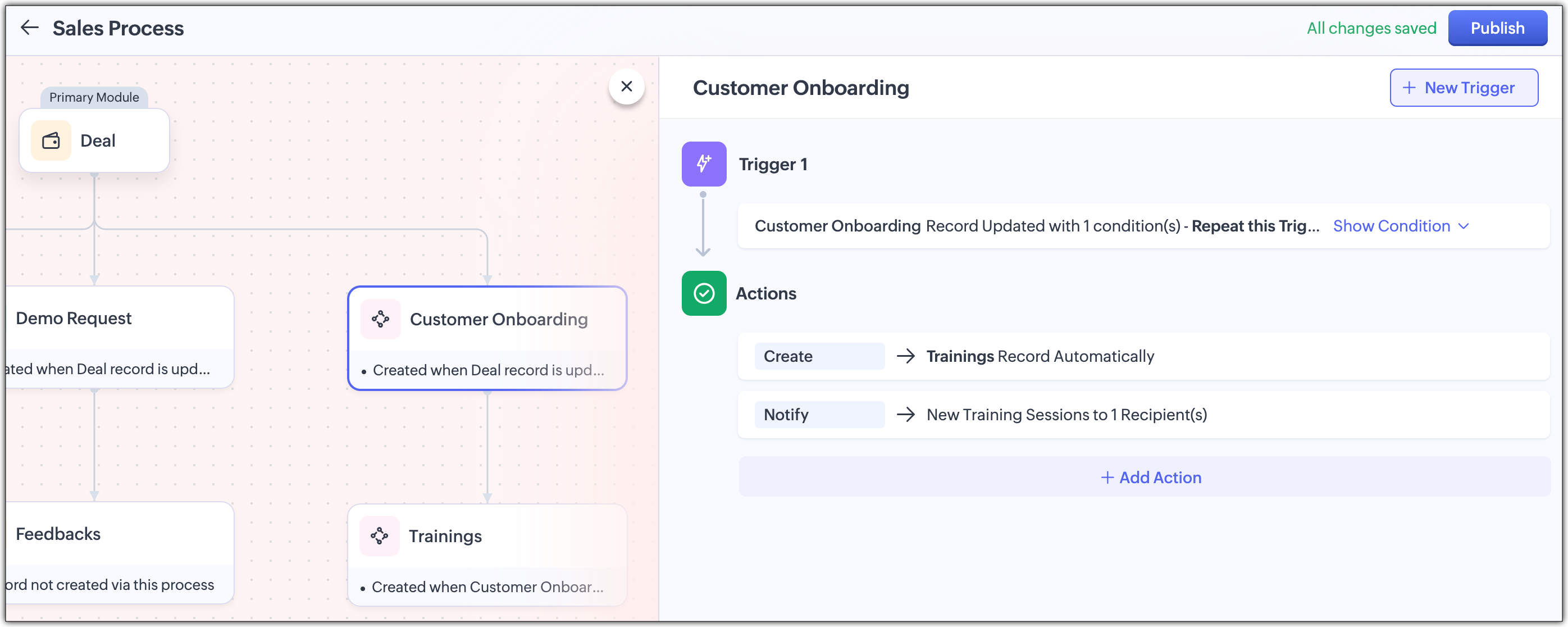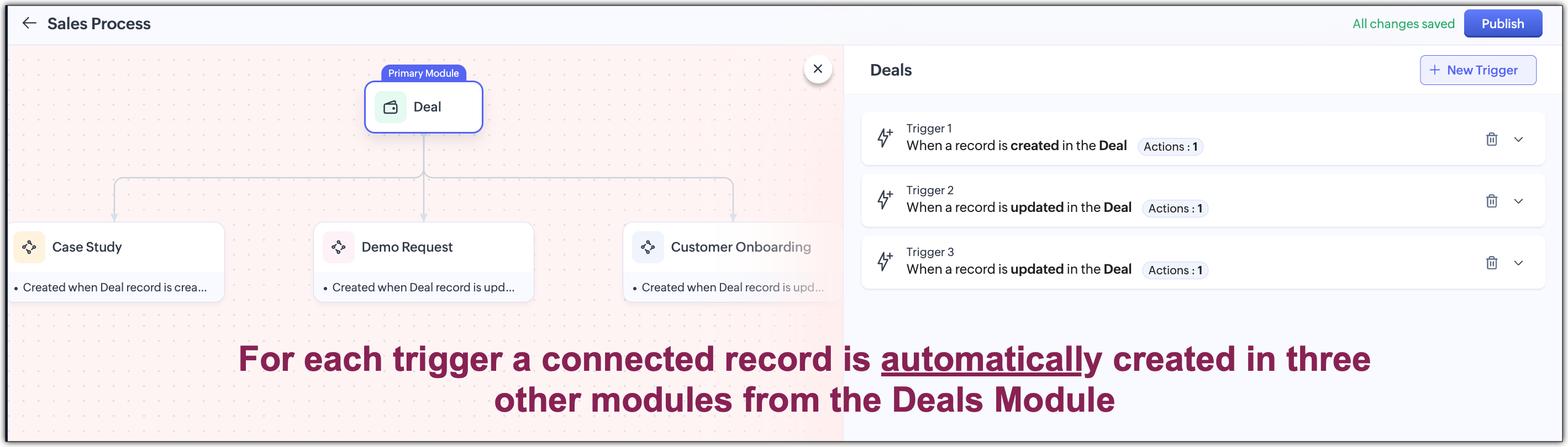 - Create a trigger for the primary module or associated modules to trigger actions to be completed in other modules.