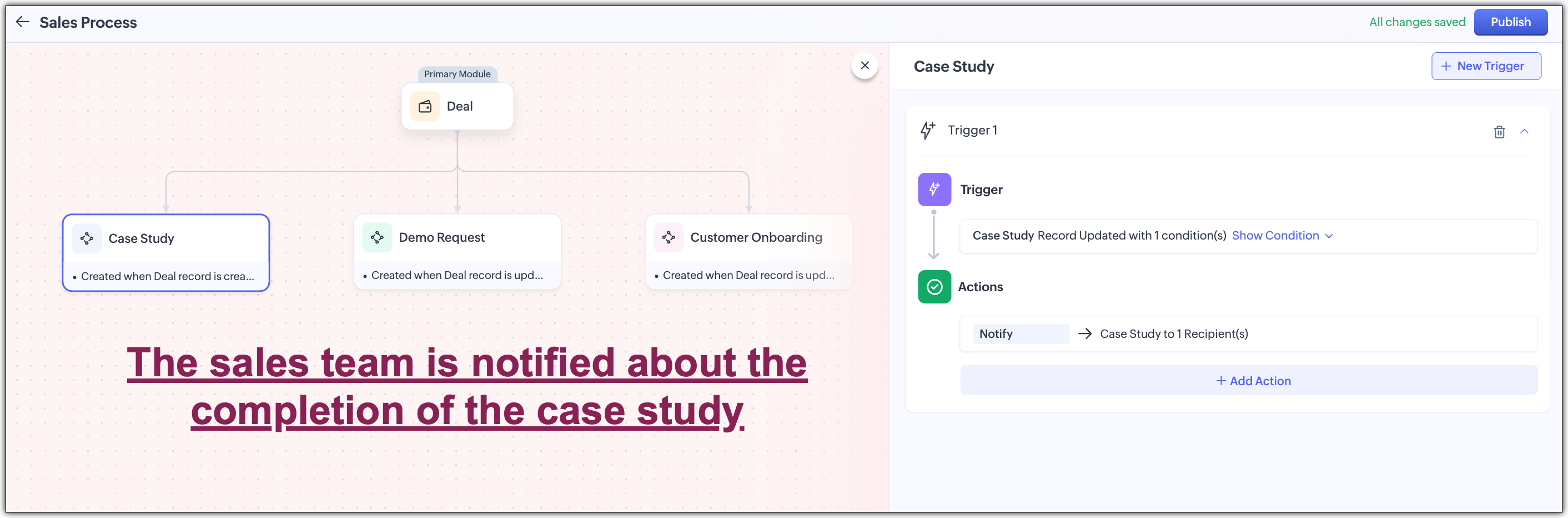 Let’s say you choose the criteria to match all connected records, in that case, the record status can be marked as “Completed” only when all case study requests for the lead have been fulfilled. On the other hand, if you select the criteria to match any connected record in related modules, the status can be marked as “Completed” as soon as at least one case study request is fulfilled.