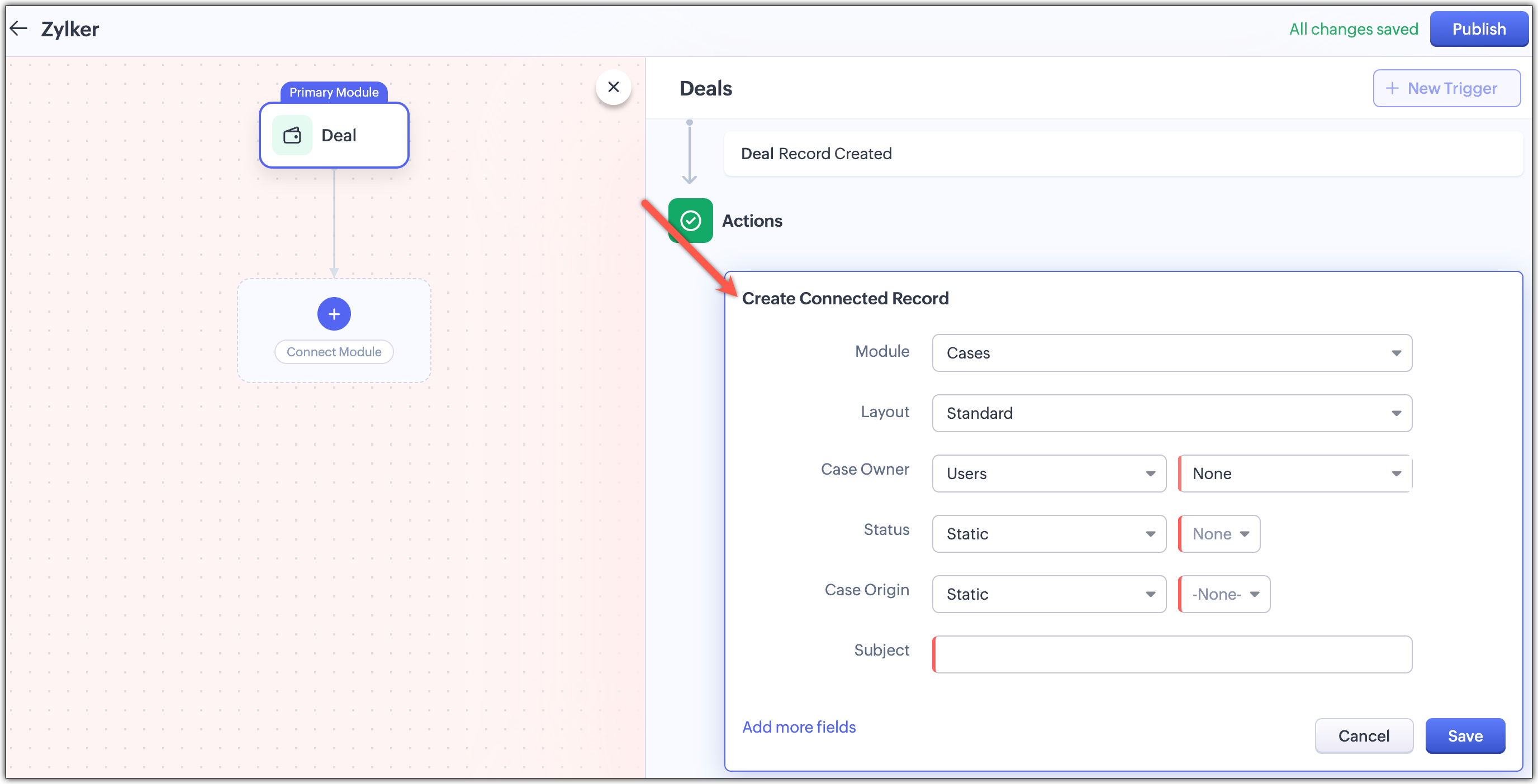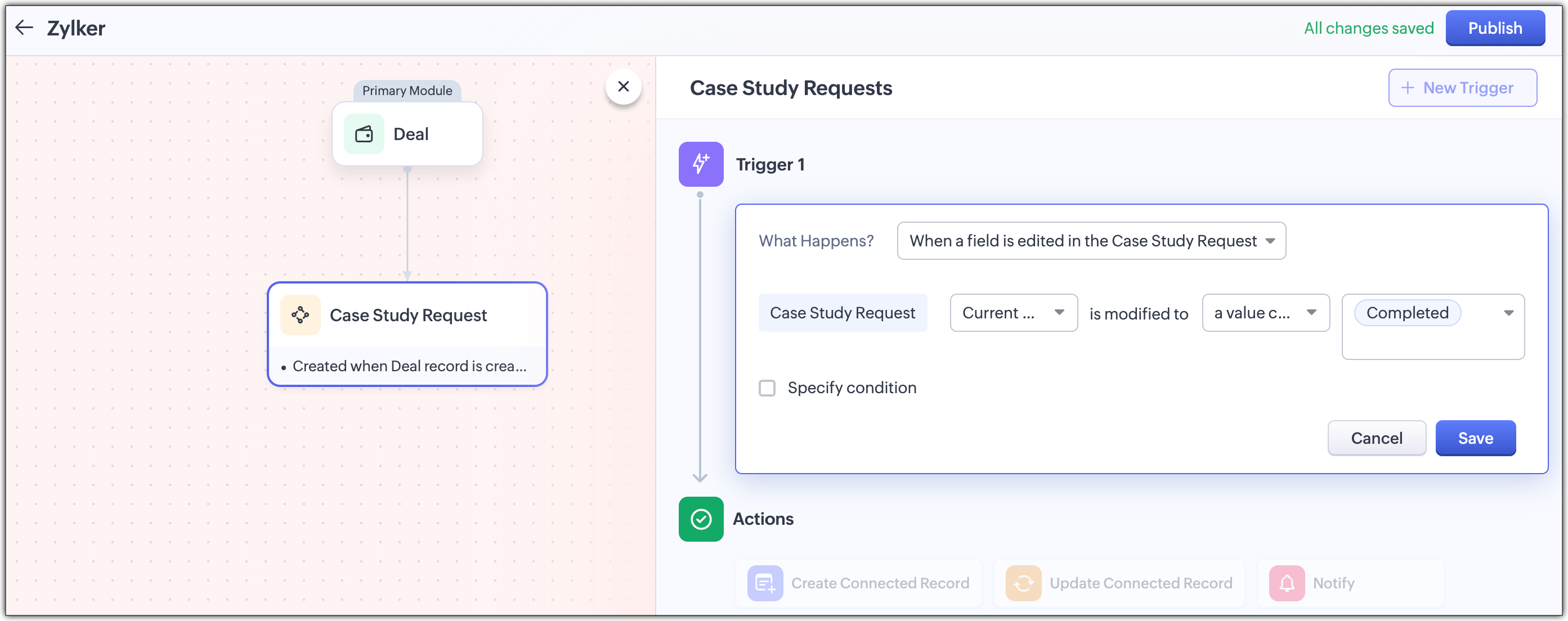 Connected workflows allow you to configure multiple criteria for triggers to execute actions in any other related modules; you can do so by enabling the other module criteria option. This way, whenever records are created/edited or when fields are edited in other modules with values that match the value specified in the trigger, the actions you configure below will also take place.