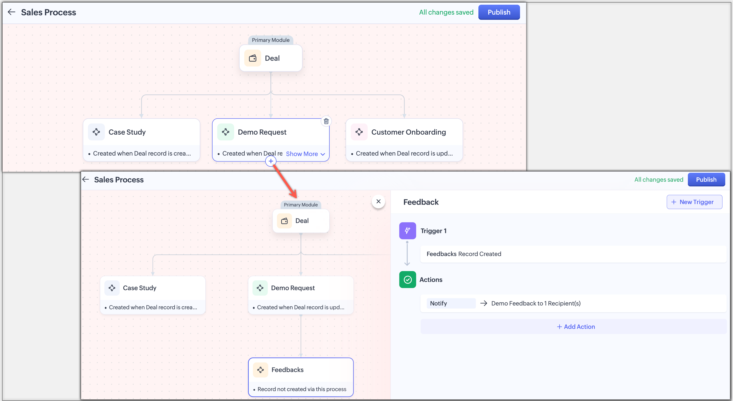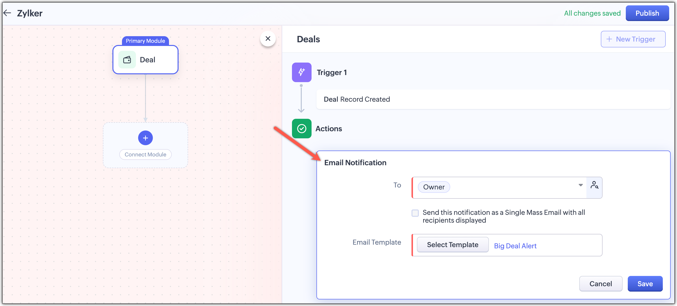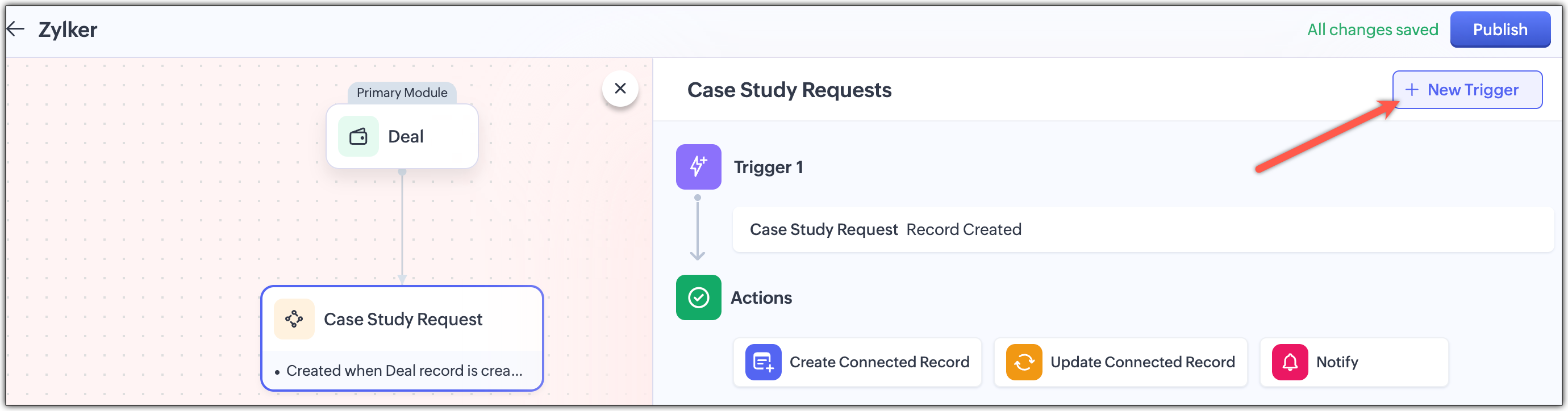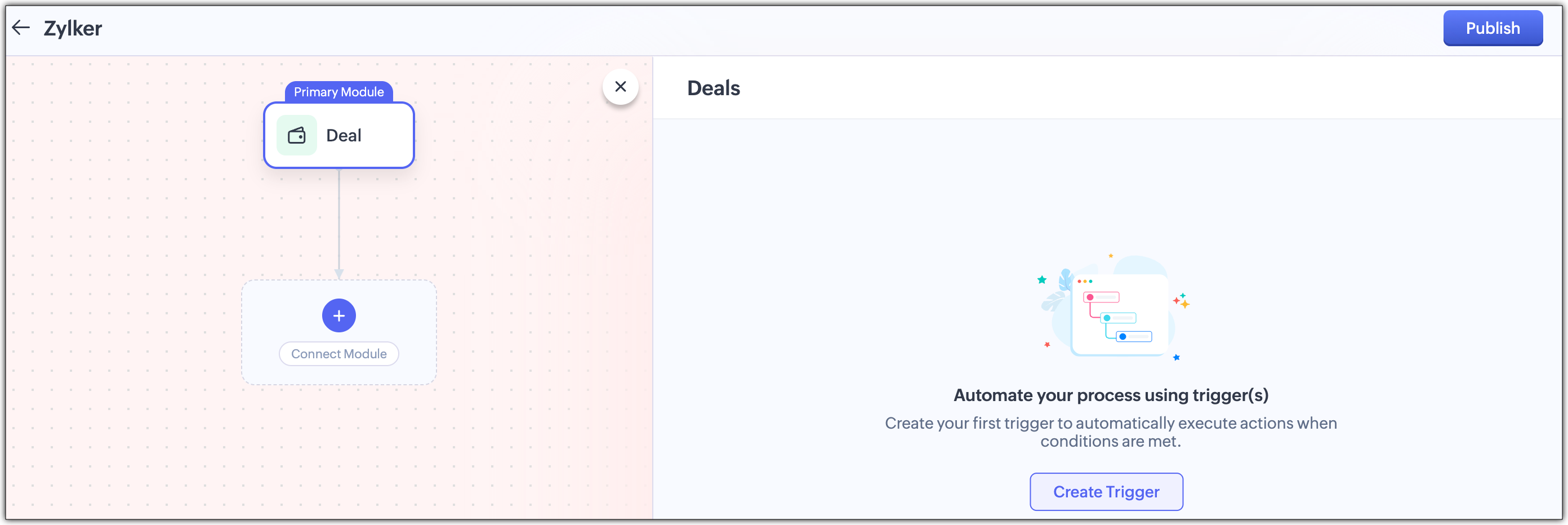 Note: You can only create ONE connected workflow for a primary module. For example, if you've created a connected workflow for the Deals module, you cannot create another connected workflow for the same module again. - Set Triggers
