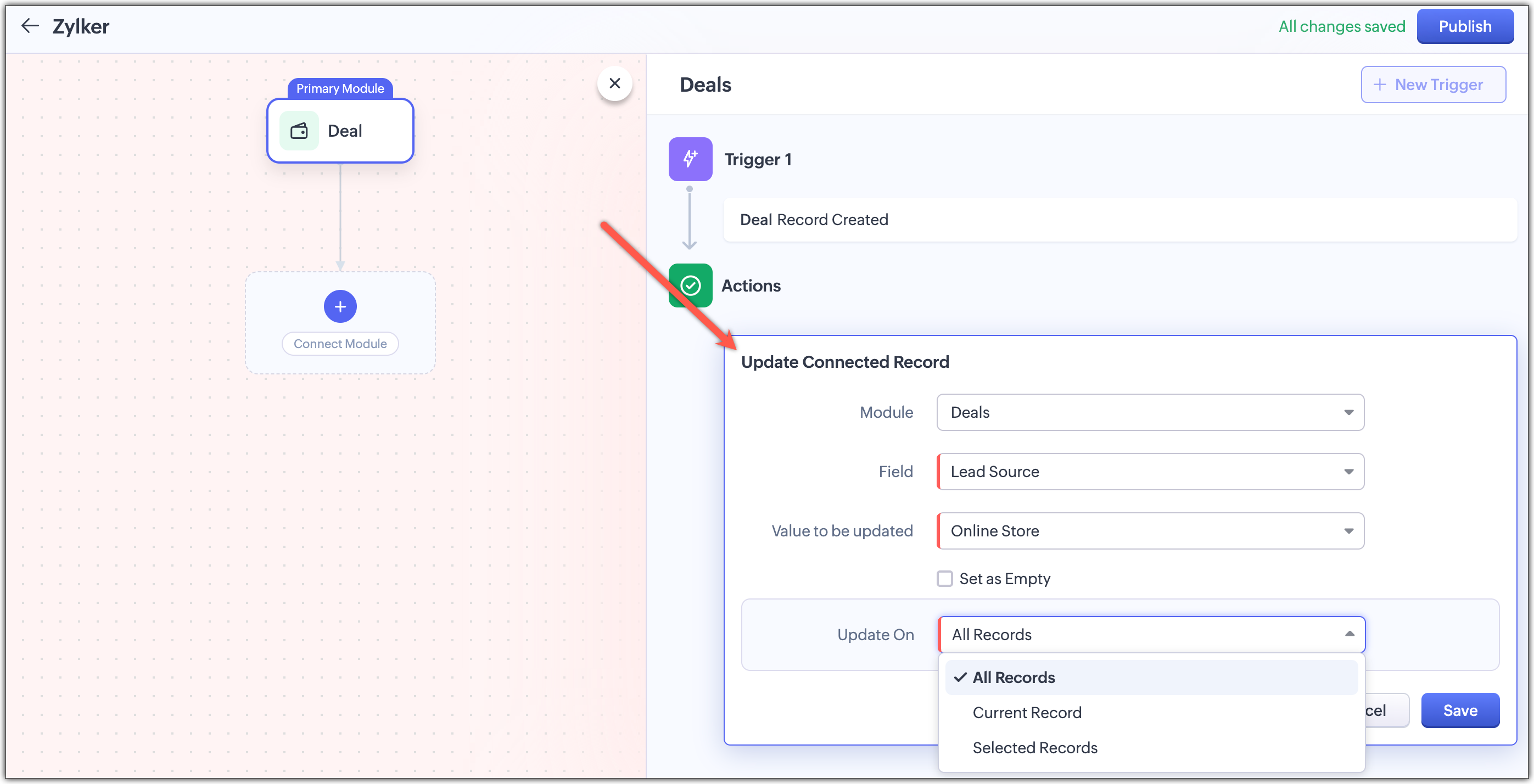 - Update an connected record : Select the module whose connected record needs to be updated, choose the field to be updated, and enter the value for that field. Next, choose if you want to update the field in All Records, Current Records, or only Selected Records and click Save.