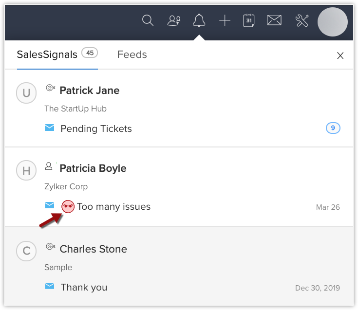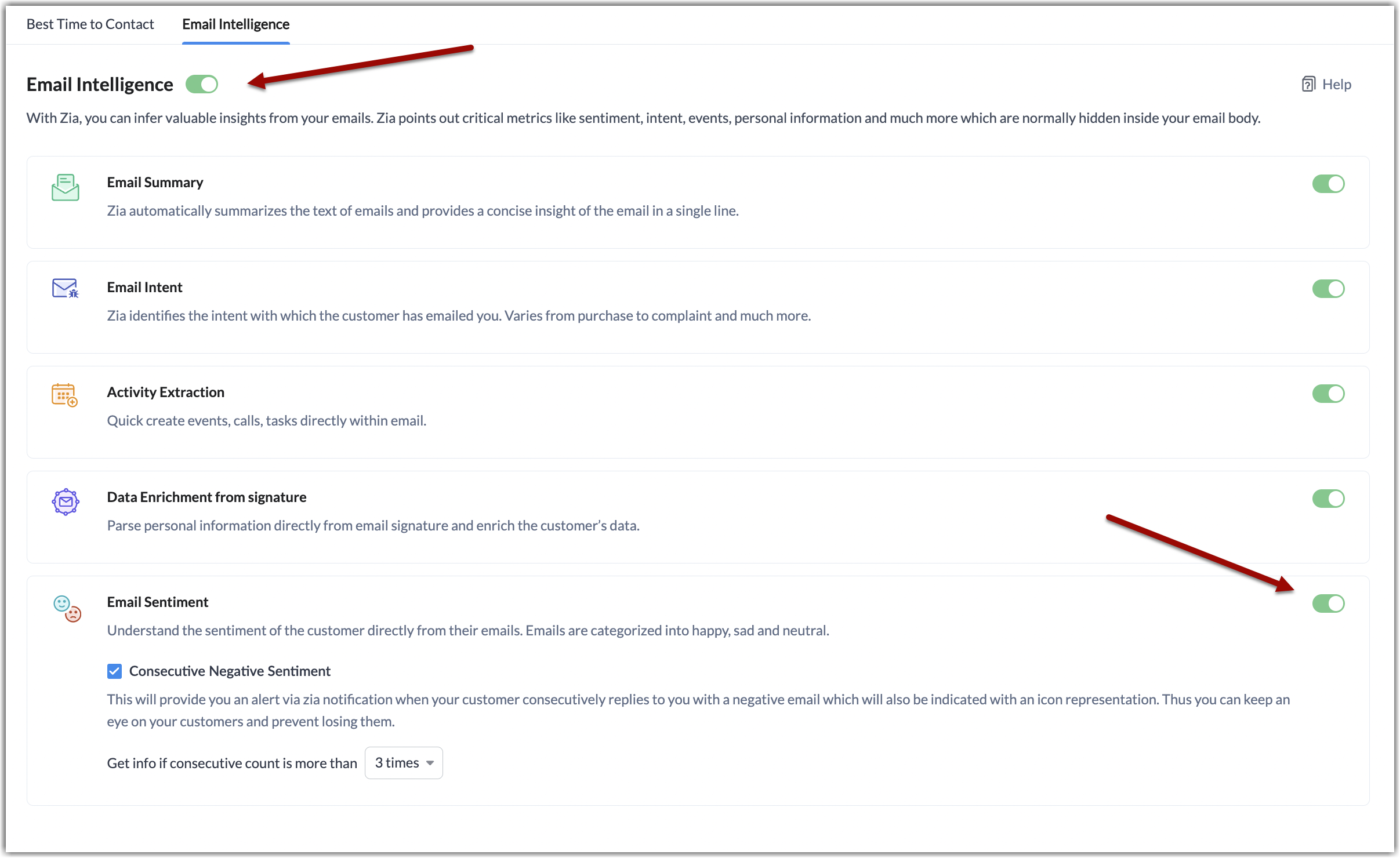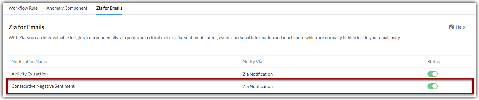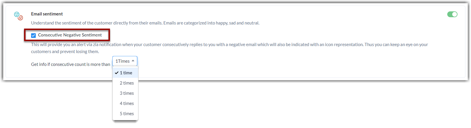 Admins can turn on alerts for consecutive negative email sentiments. Zia notifications for consecutive negative email sentiments will give users a heads up every time a customer sends consecutive negative emails. With this alert users can then keep an eye on customers who are not satisfied with the organization's services, take insights from previous conversations and act accordingly which might help retain a customer who otherwise could have been lost.