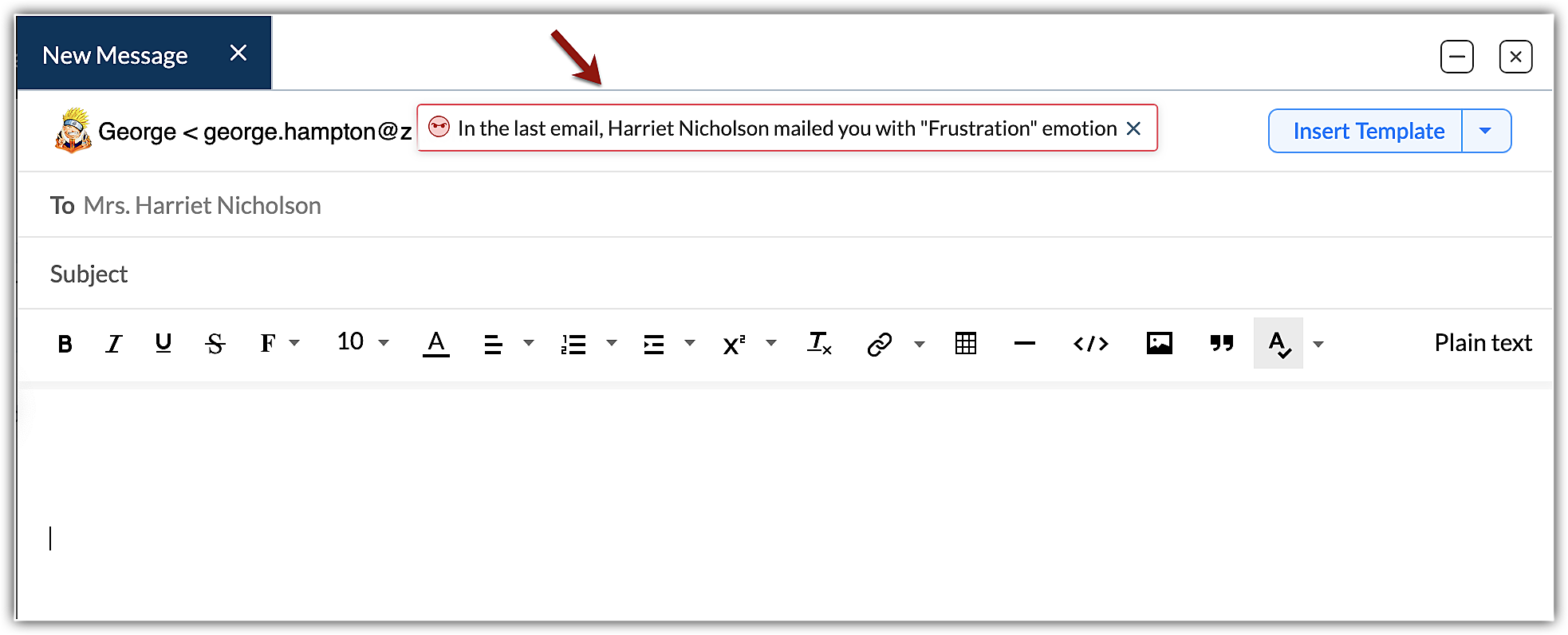 Email compose: When you create a new mail for a record, the latest emotion calibrated for the email address will be displayed to let you draft the email keeping the observed emotion in mind.