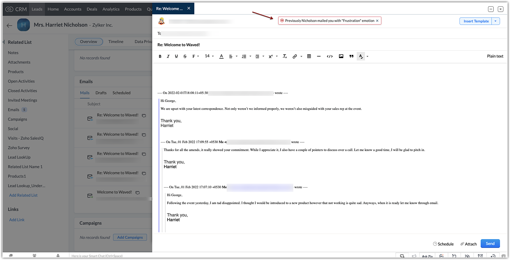 The emotions captured from an incoming email are displayed in the following places in Zoho CRM.