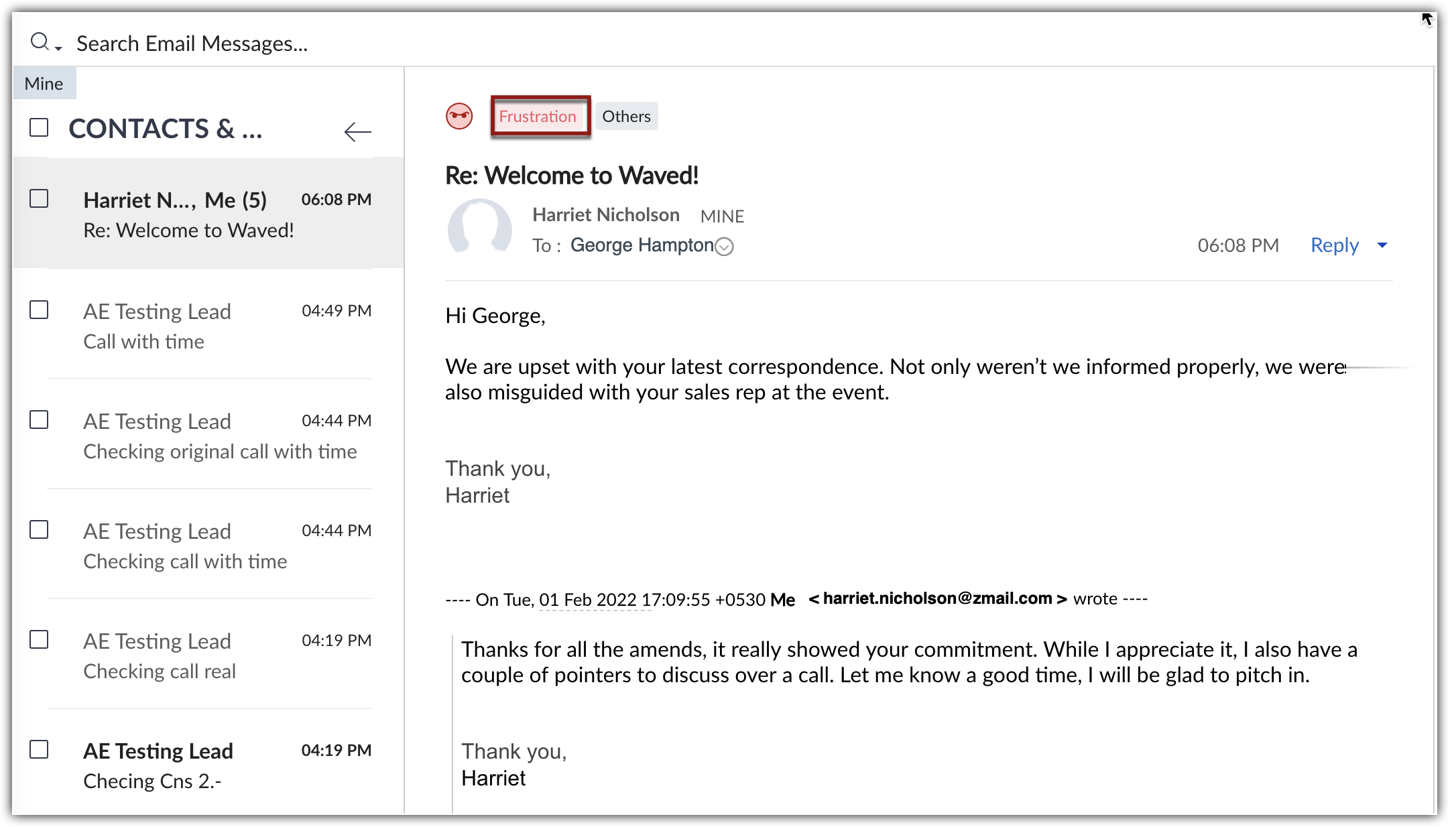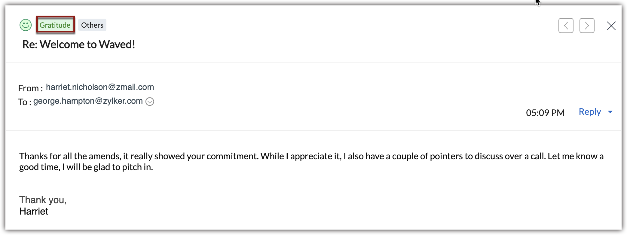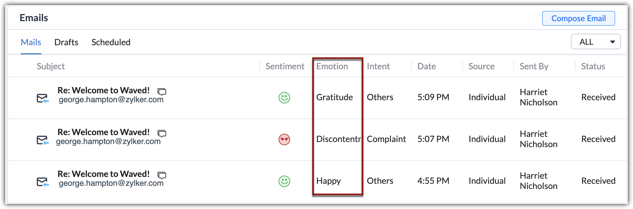 Inside the Email: Inside email, the emotions are displayed on the top-left corner. If a record has multiple email exchanges, the emotion will be displayed for each email.