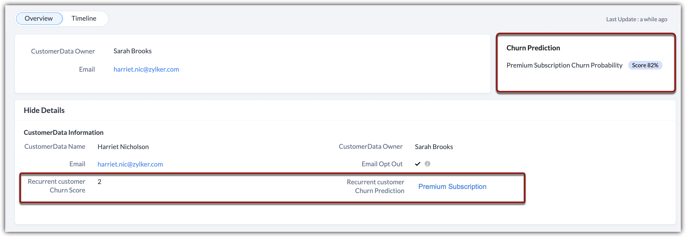 - Churn prediction: The prediction field displays the active subscription field associated with the customer record.