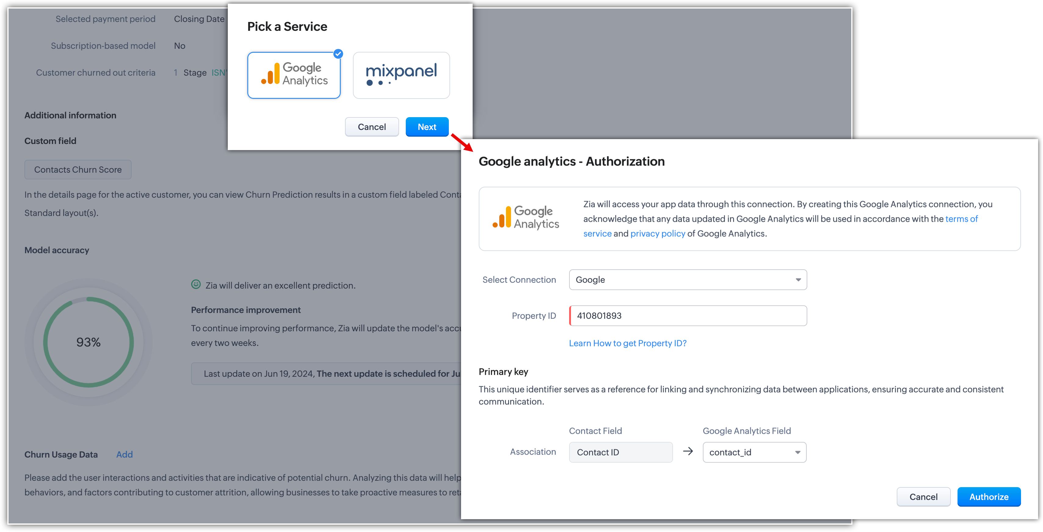 In addition to transactional data and usage data, Zia Churn can also integrate with data sources like Google Analytics. This integration enables Zia to analyze customer interactions with your services. Customers who already have churn predictions set up in the CRM will have the option to enable churn based on usage data.