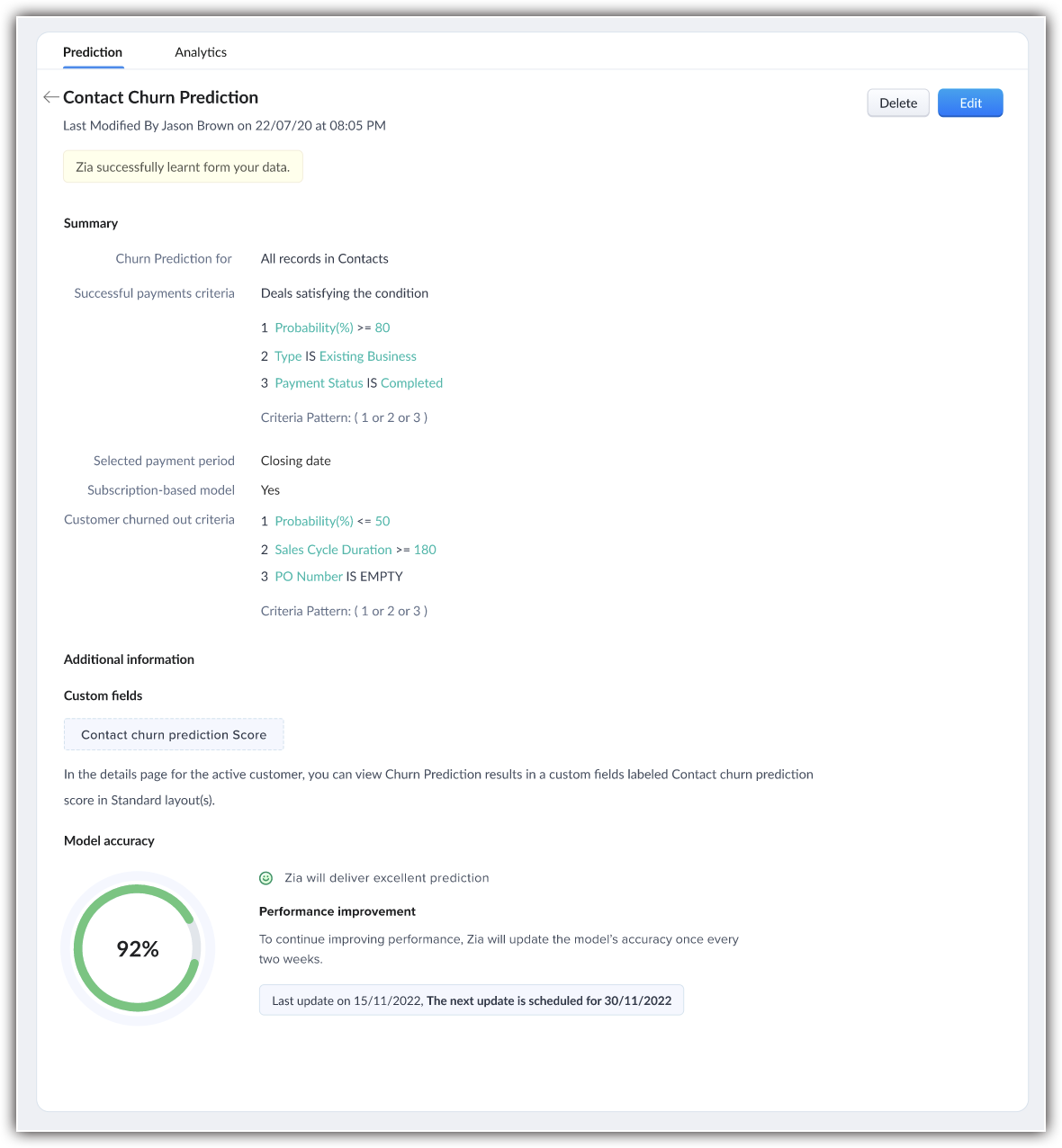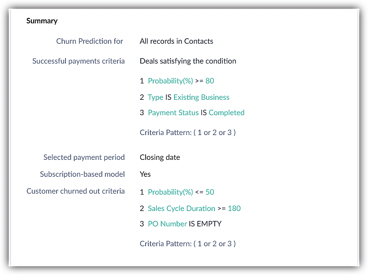 For example, you can instruct Zia to classify records below 50% of deal probability as a churning customer.