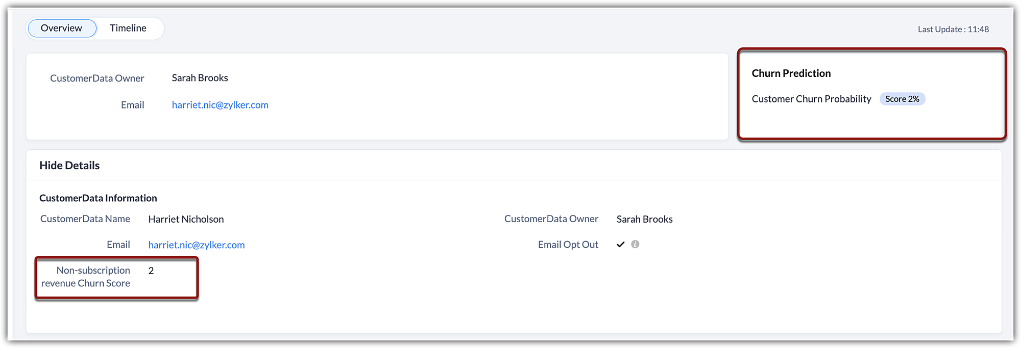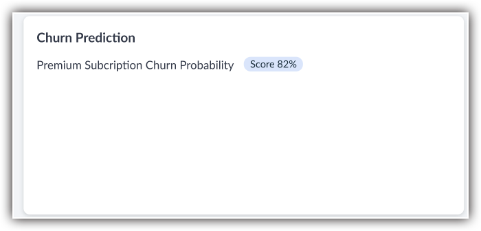 On the churn prediction widget, you can see the churn probability as a numerical score shown on a customer record. The higher the score, the higher the probability of churn.