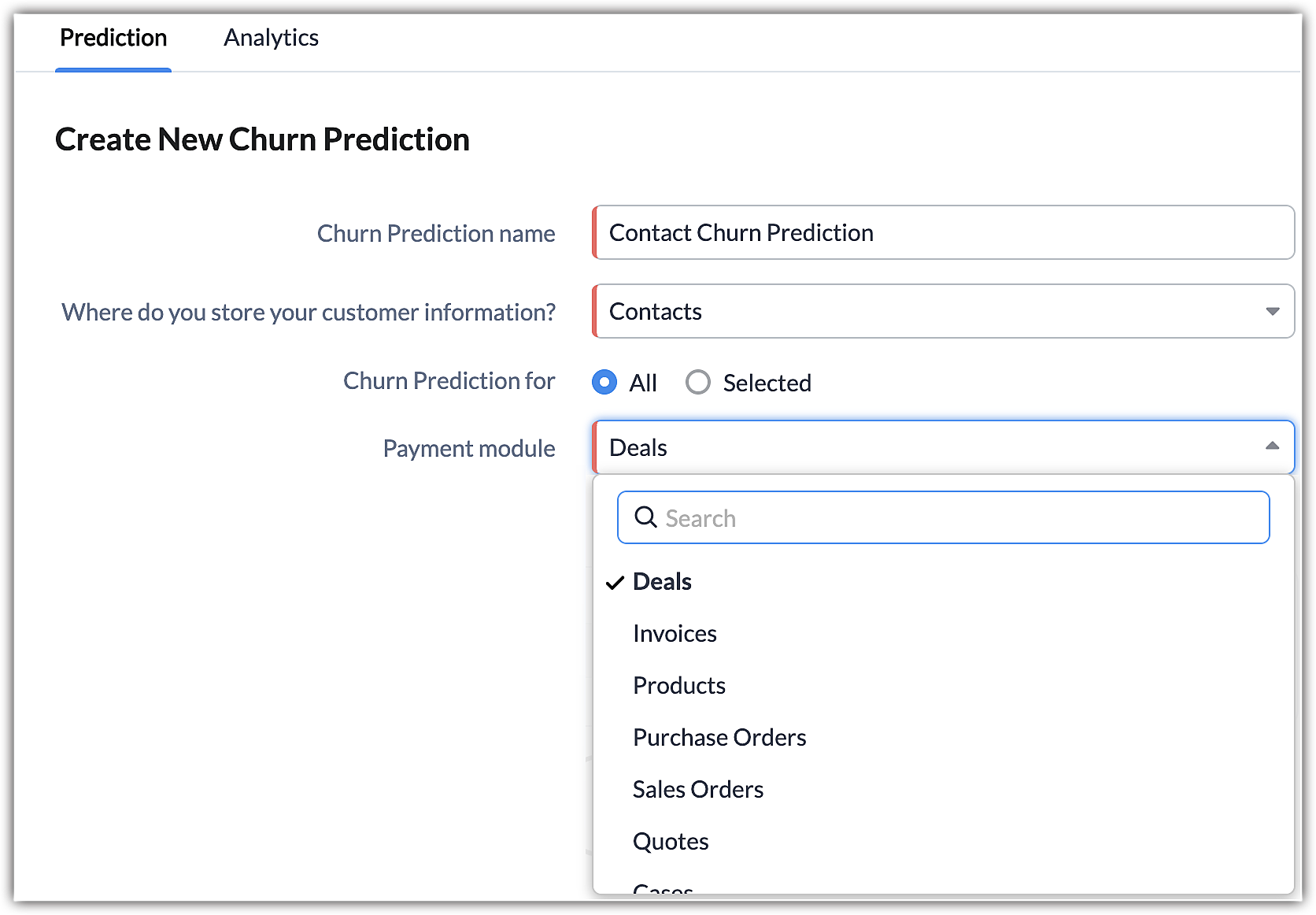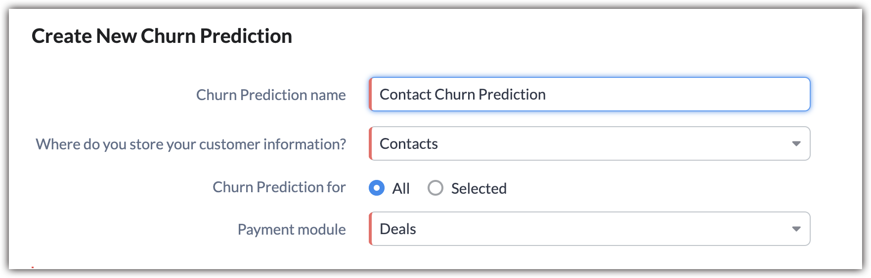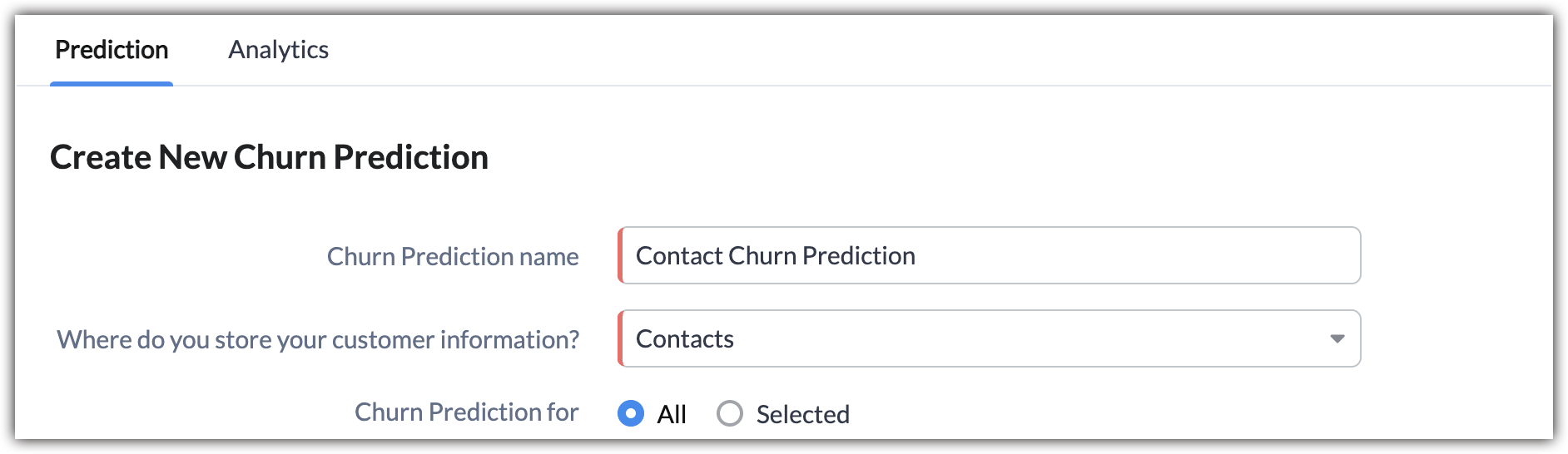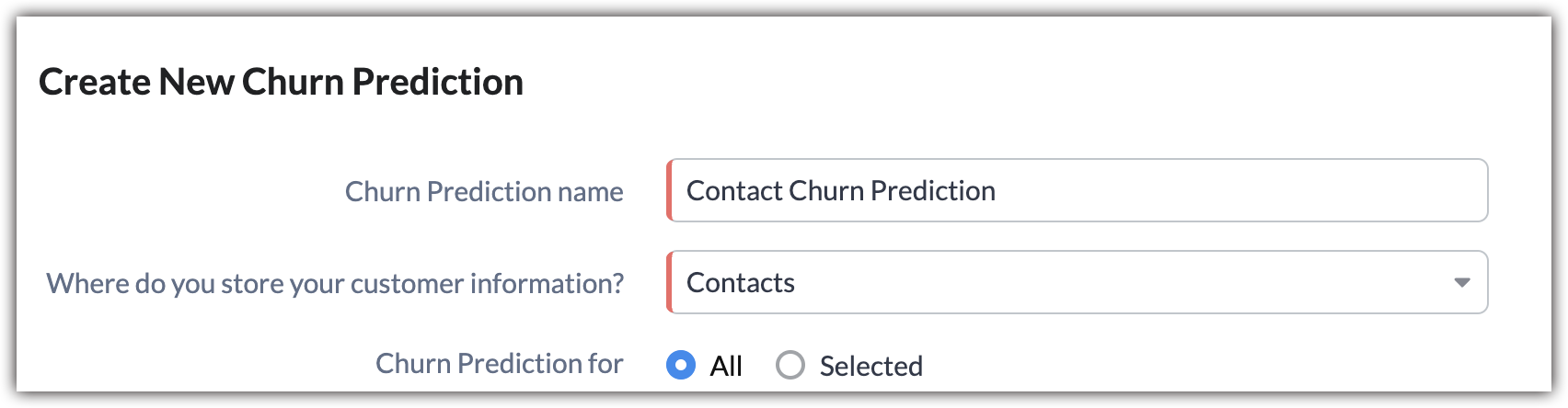 - In the Churn prediction for option, select All if you want to predict for all records in your customer module.
