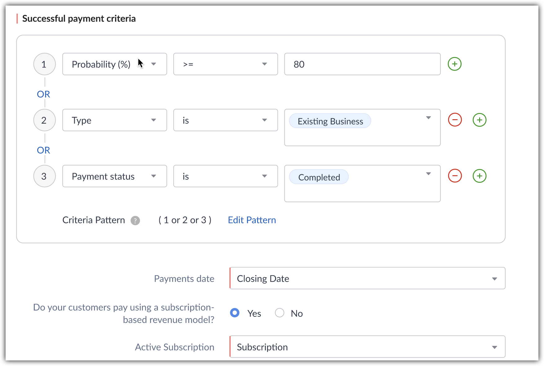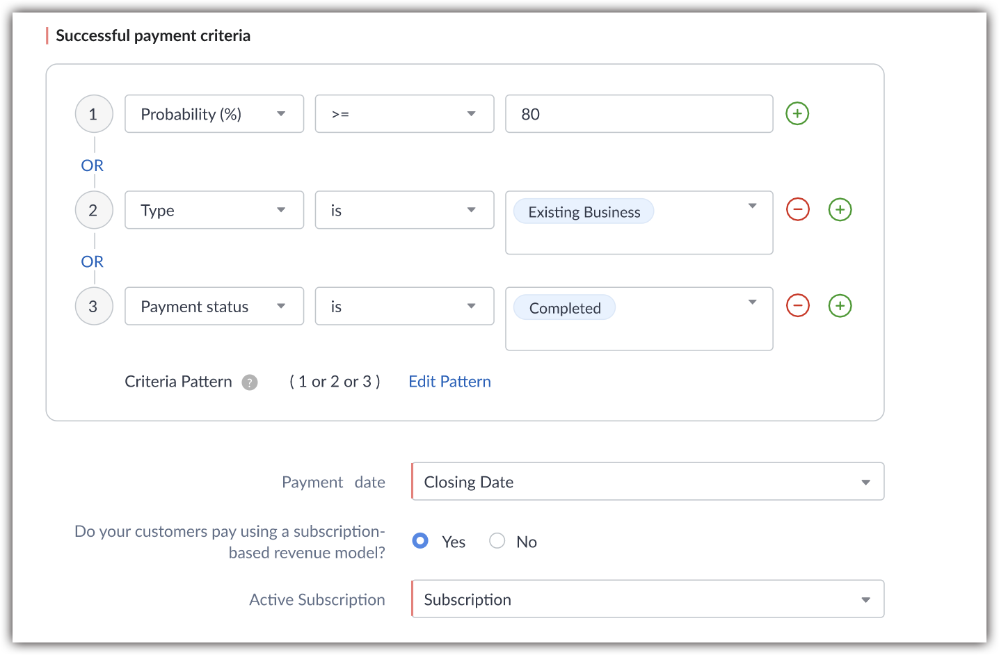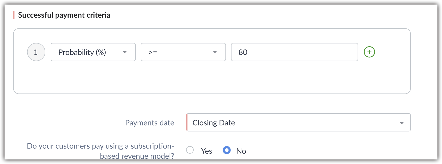 Now that Zia knows who your customers are and where their payment information is, you have to show Zia what successful payment criteria look like. You're essentially training Zia to look for the expected behaviors of active customers.