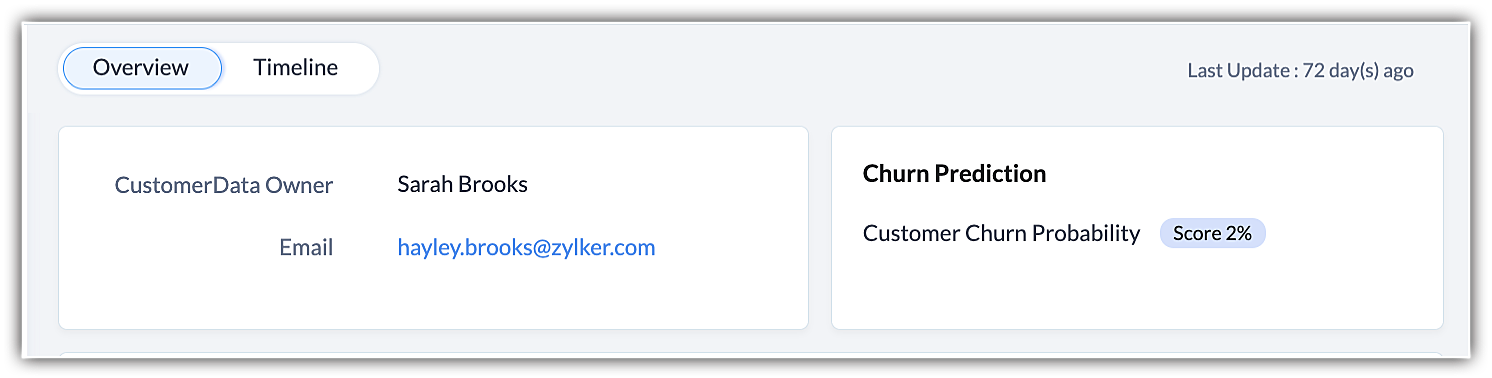 - If Zia predicts a potential churn, a widget will be displayed on the record details page of the qualified record, along with the name of the prediction rule and the churn probability score.